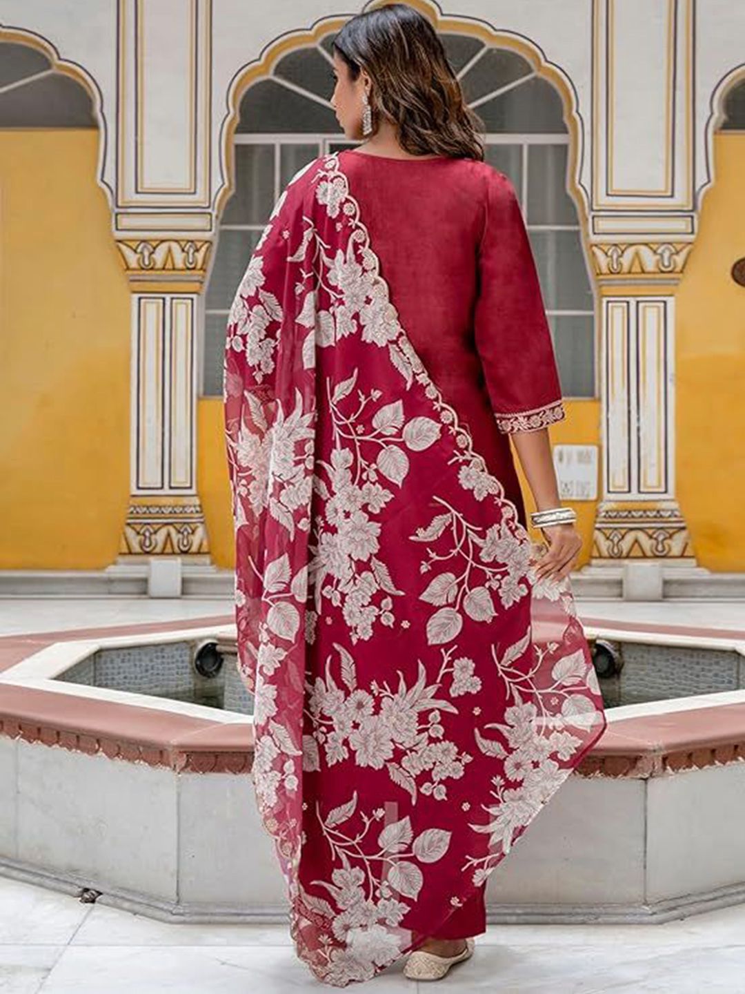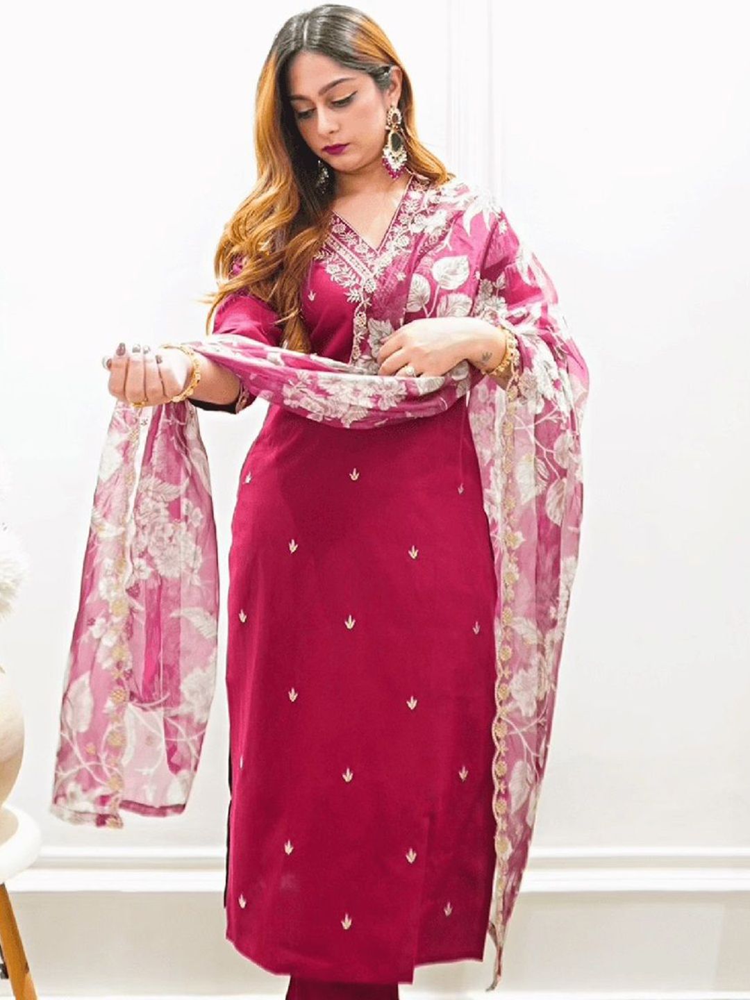 VredeVogel Floral Embroidered Thread Work Straight Kurta With Trousers & Dupatta