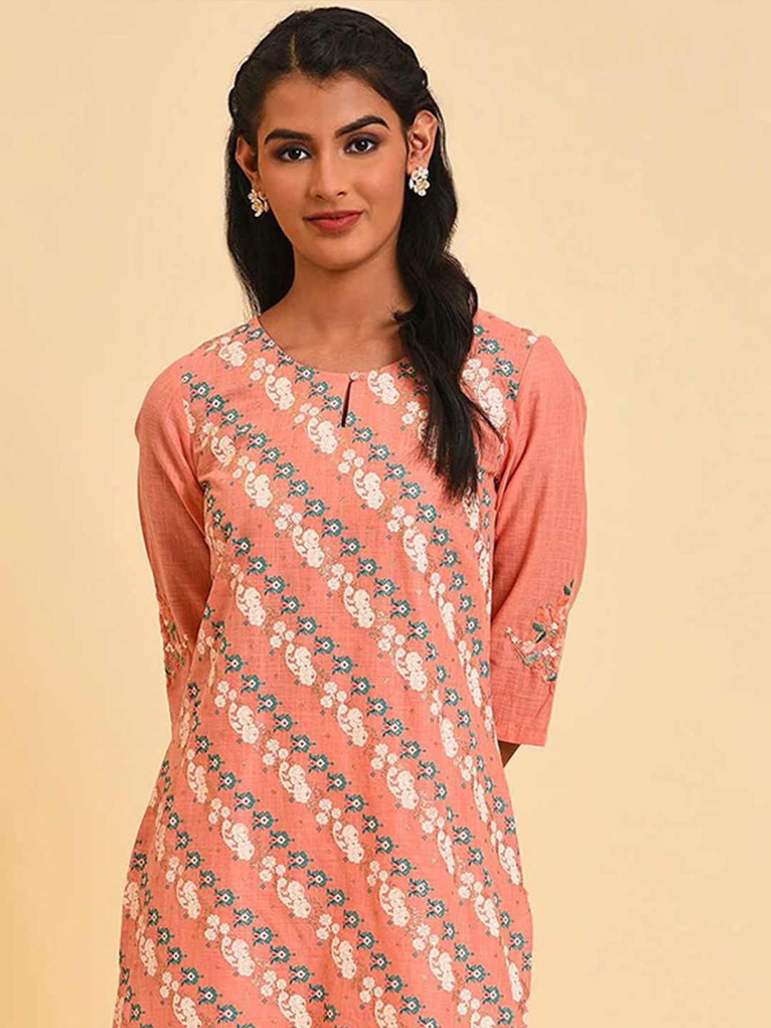 W Floral Printed Pure Cotton Notch Neck Straight Kurta With Leggings