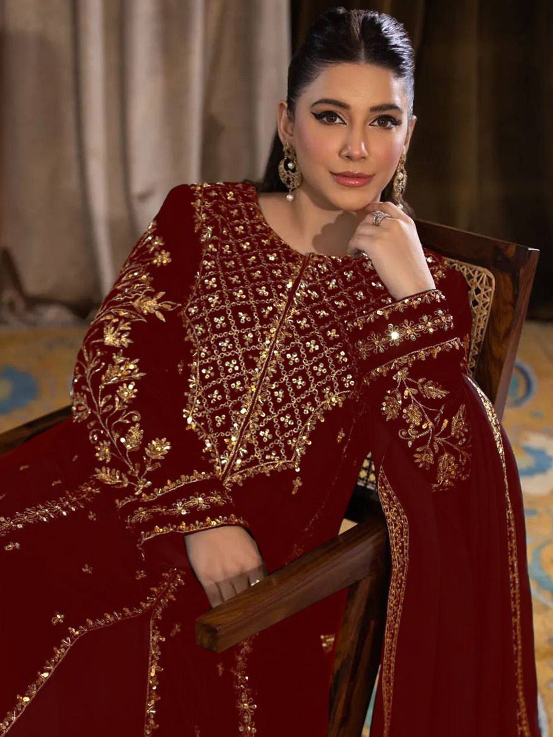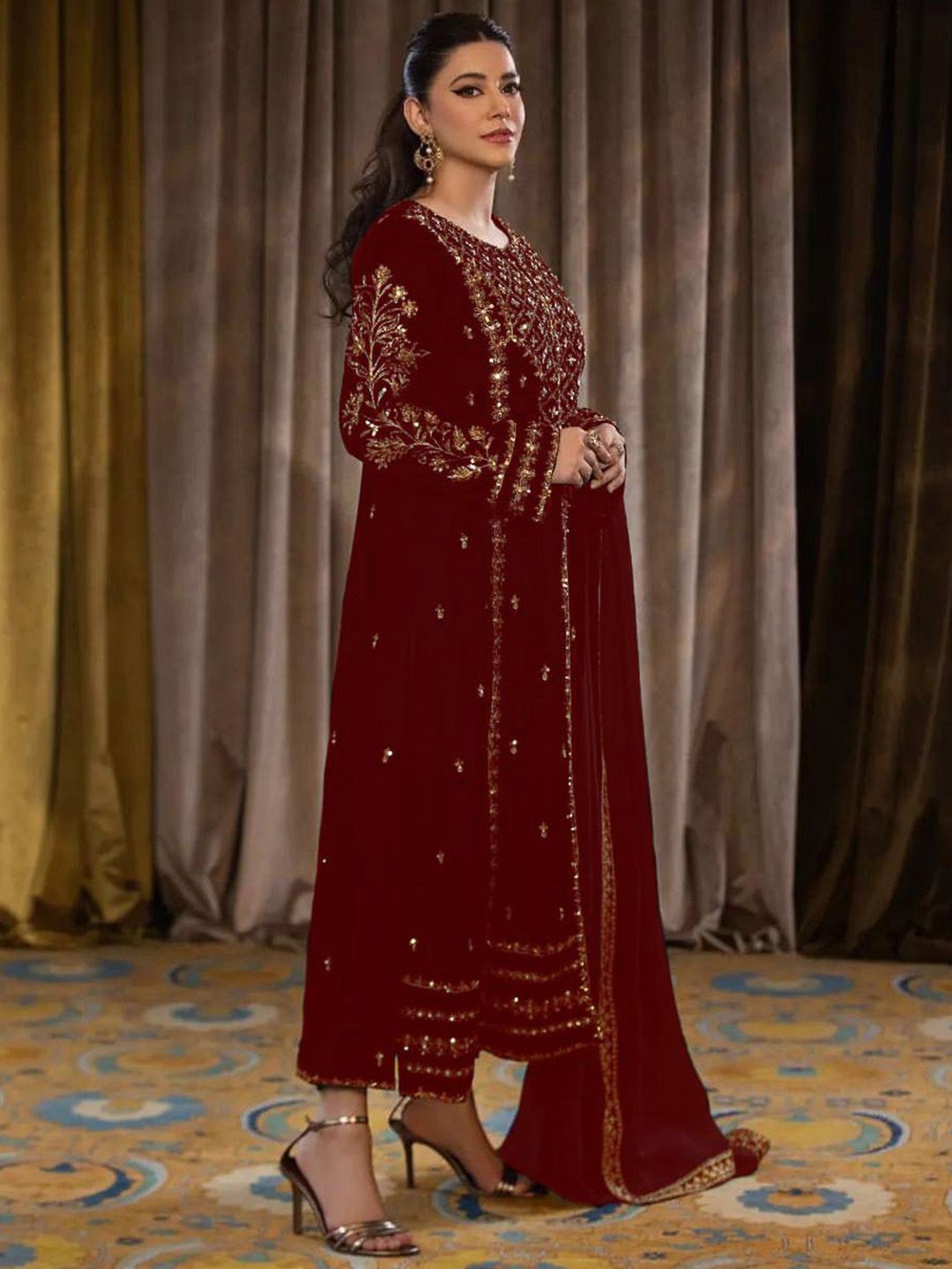WAZIX Clothing Embroidered Regular Velvet Kurta with Trousers & With Dupatta