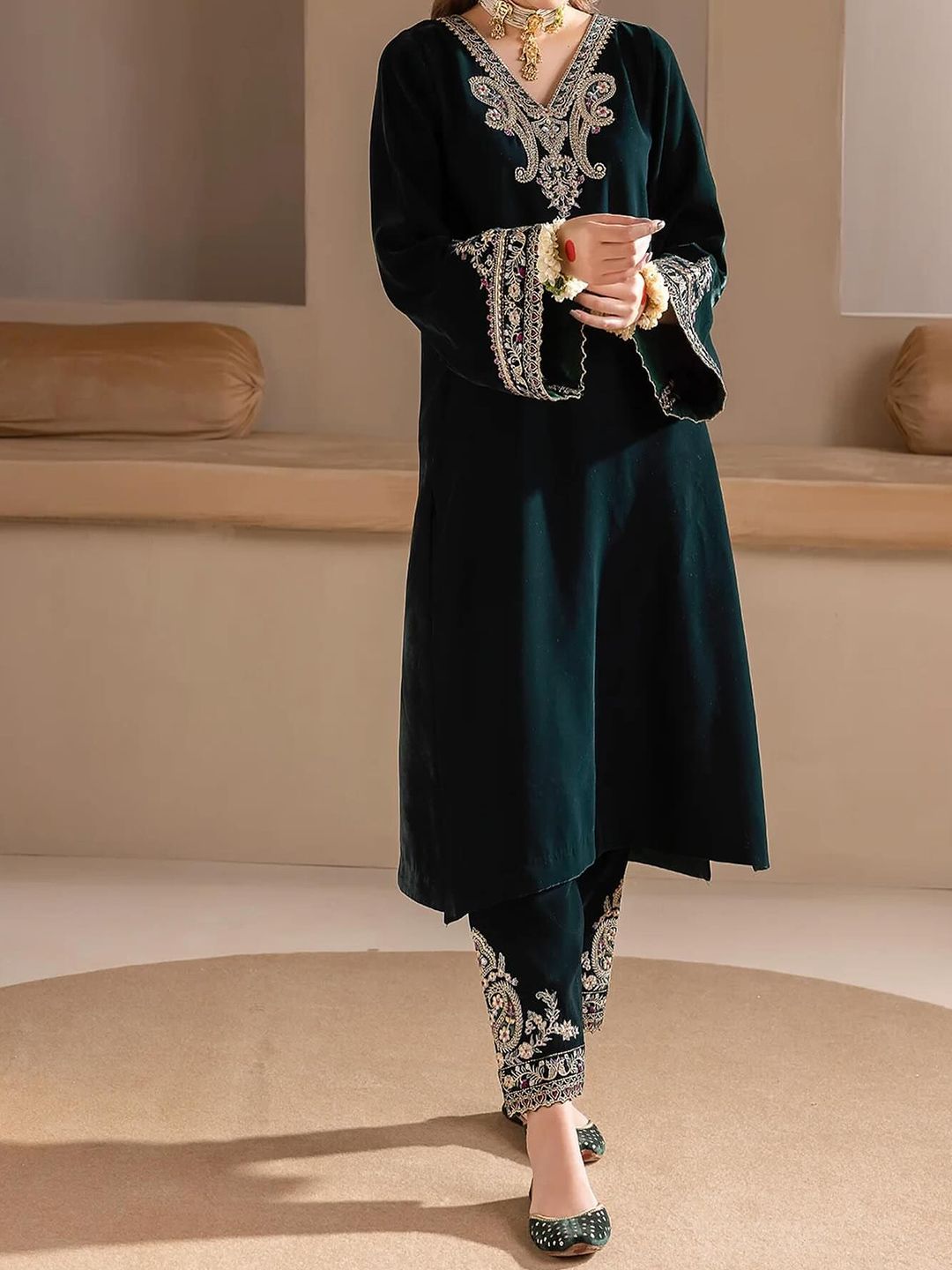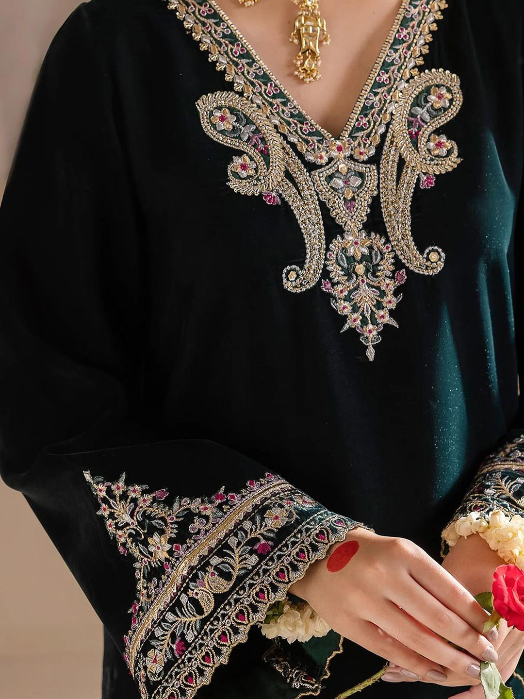 WAZIX Clothing Floral Embroidered V Neck Zari Velvet Kurta With Trousers & Dupatta