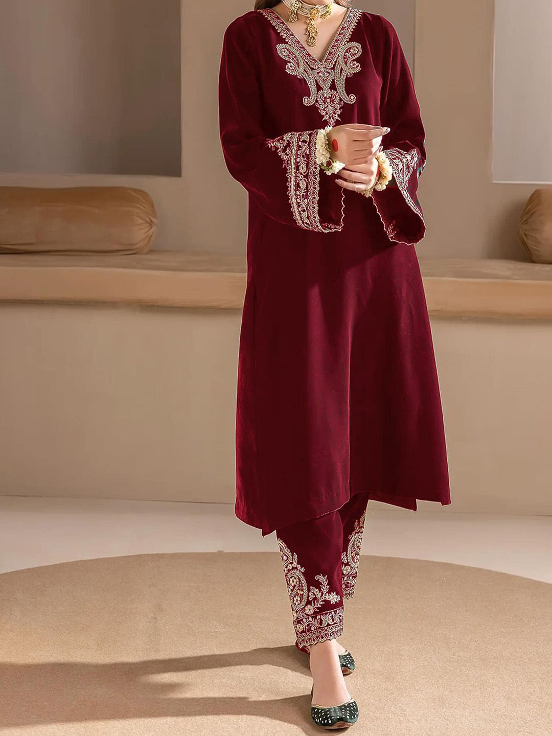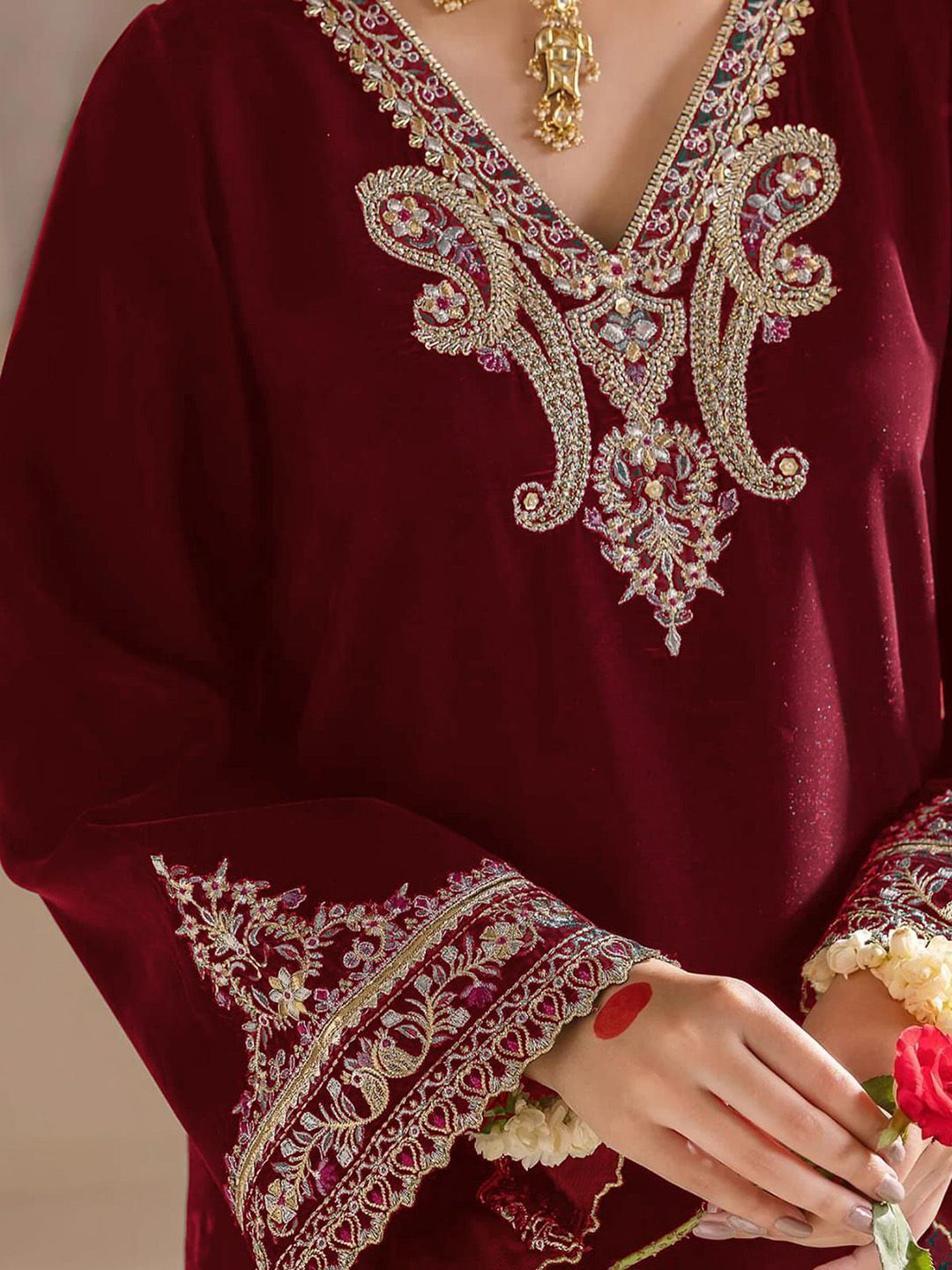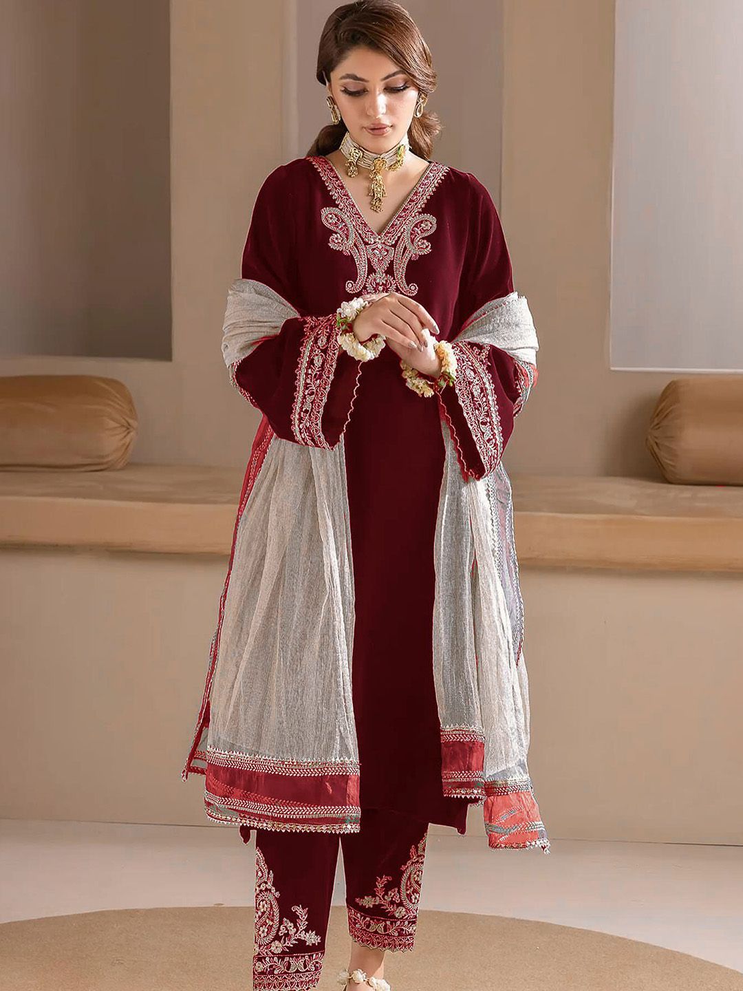 WAZIX Clothing Floral Embroidered Velvet V-Neck A-Line Kurta with Trousers & Dupatta