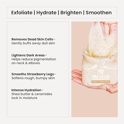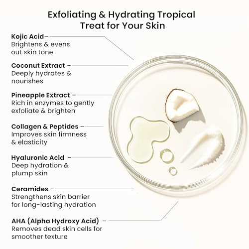 Made with Sugar, Shea Butter, Pineapple, Avocado, Sweet Almond, Coconut, Orange and an array of natural oils. Infused with Kojic Acid, Hyaluronic Acid, Ceramides, Collagen & Peptides Exfoliating body scrub removes dull, dry skin to reveal glowing, soft, smooth skin. Deeply nourish and balance skin’s hydration to help restore skin's natural glow. Scent: a boost of bright citrus with a touch of floral with key notes of Pineapple, Avocado, Sweet Almond, Coconut & Orange. Vegan, paraben free, sulfate free, has a no-slip formula and long-lasting fragrance.
