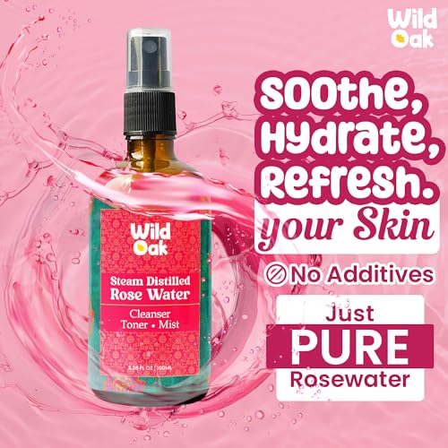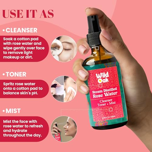 WildOak Steam Distilled 100% Pure Food Grade Rose Water | 100ml Bottle | Gulab Jal | Face Cleanser, Toner & Mist | Zero Preservative, Artificial Fragrance | Maintains Skin's Natural PH level & Tighten