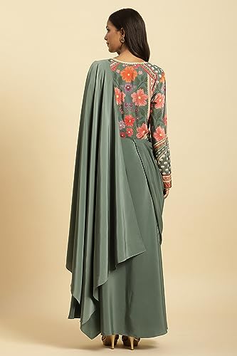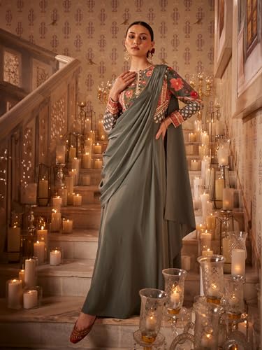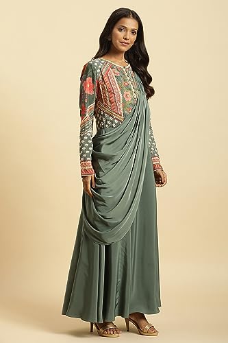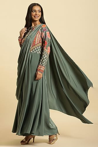 Wishful Women's Polyester By W Green Predrape Saree Dress With Multi-Coloured Embellishement_23AUS11464-122670_L