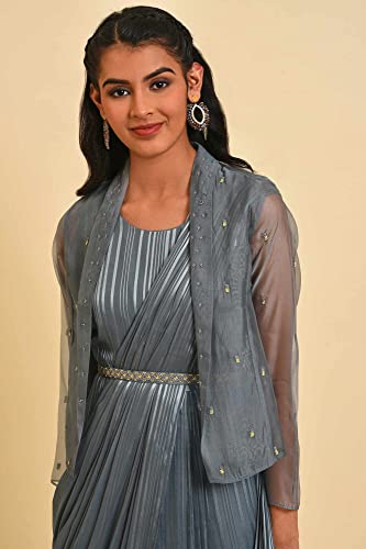 Wishful Women's Polyester Grey Festive PreDrape Saree with Short Jacket Calf Length Dress 23FESP11196-216592