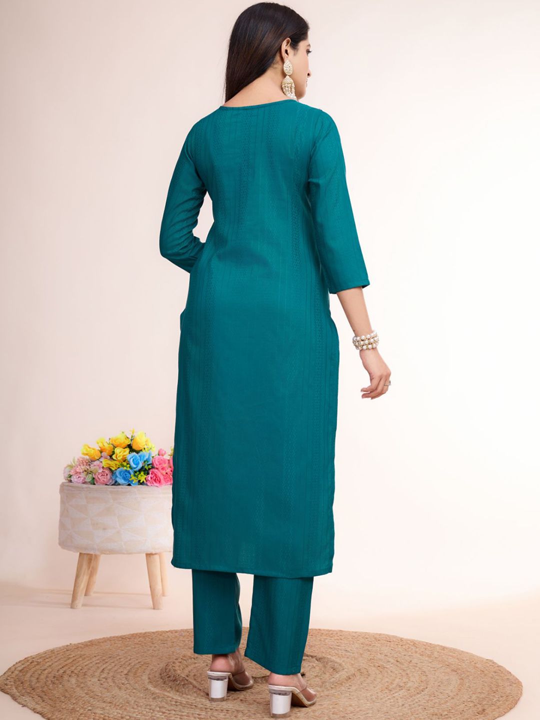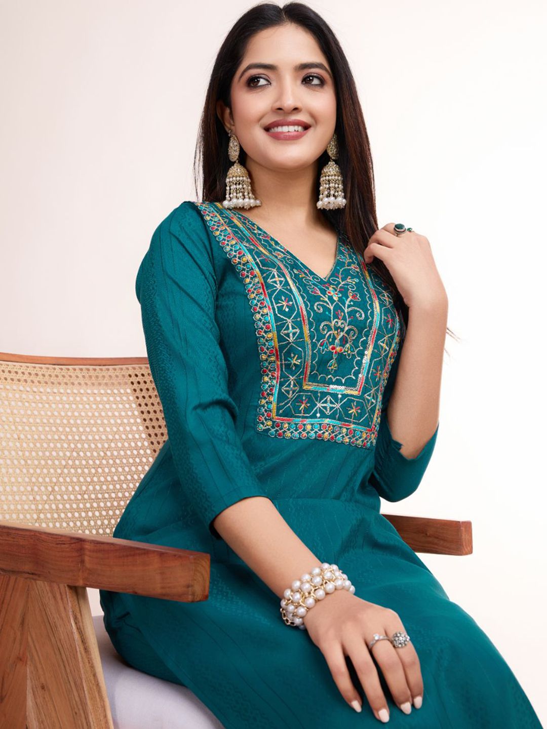 Women Basket Floral Embroidered Thread Work Jacquard V-Neck Straight Kurta With Trousers