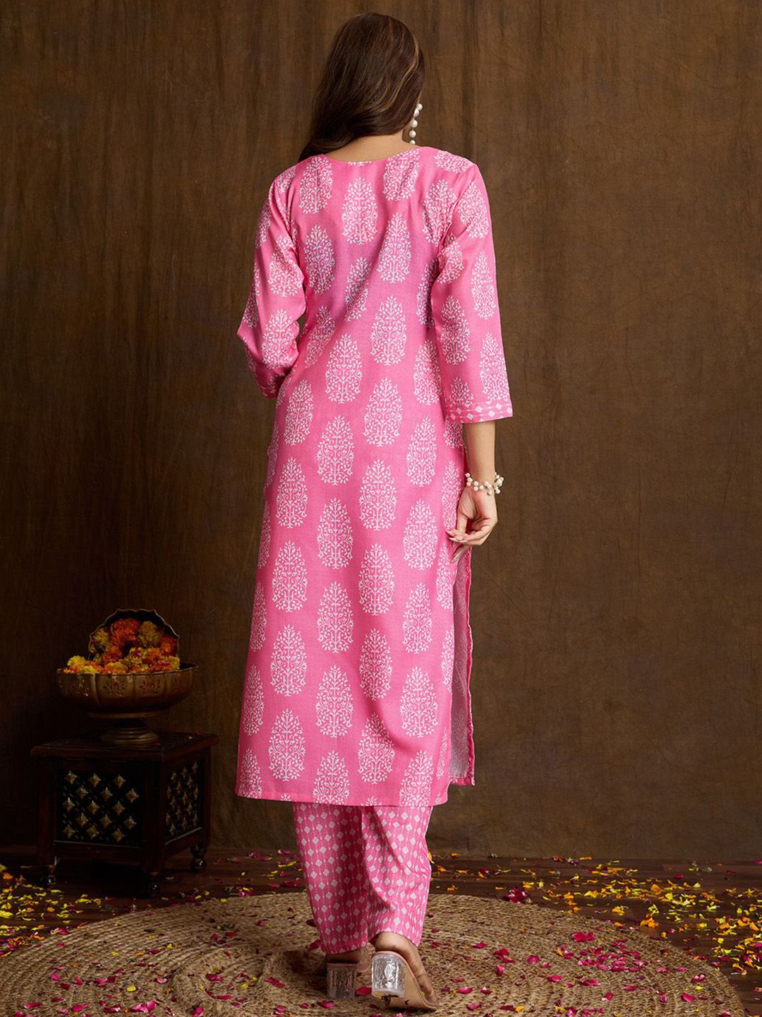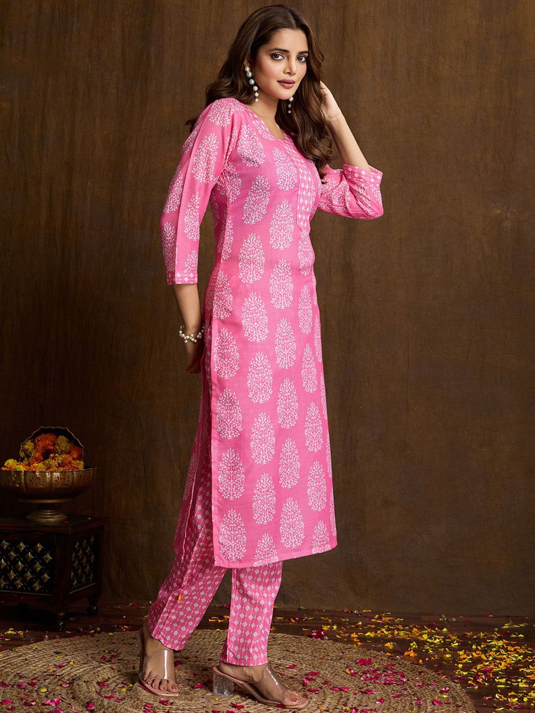 Women Basket Floral Printed Pure Cotton V-Neck Straight Kurta With Trousers