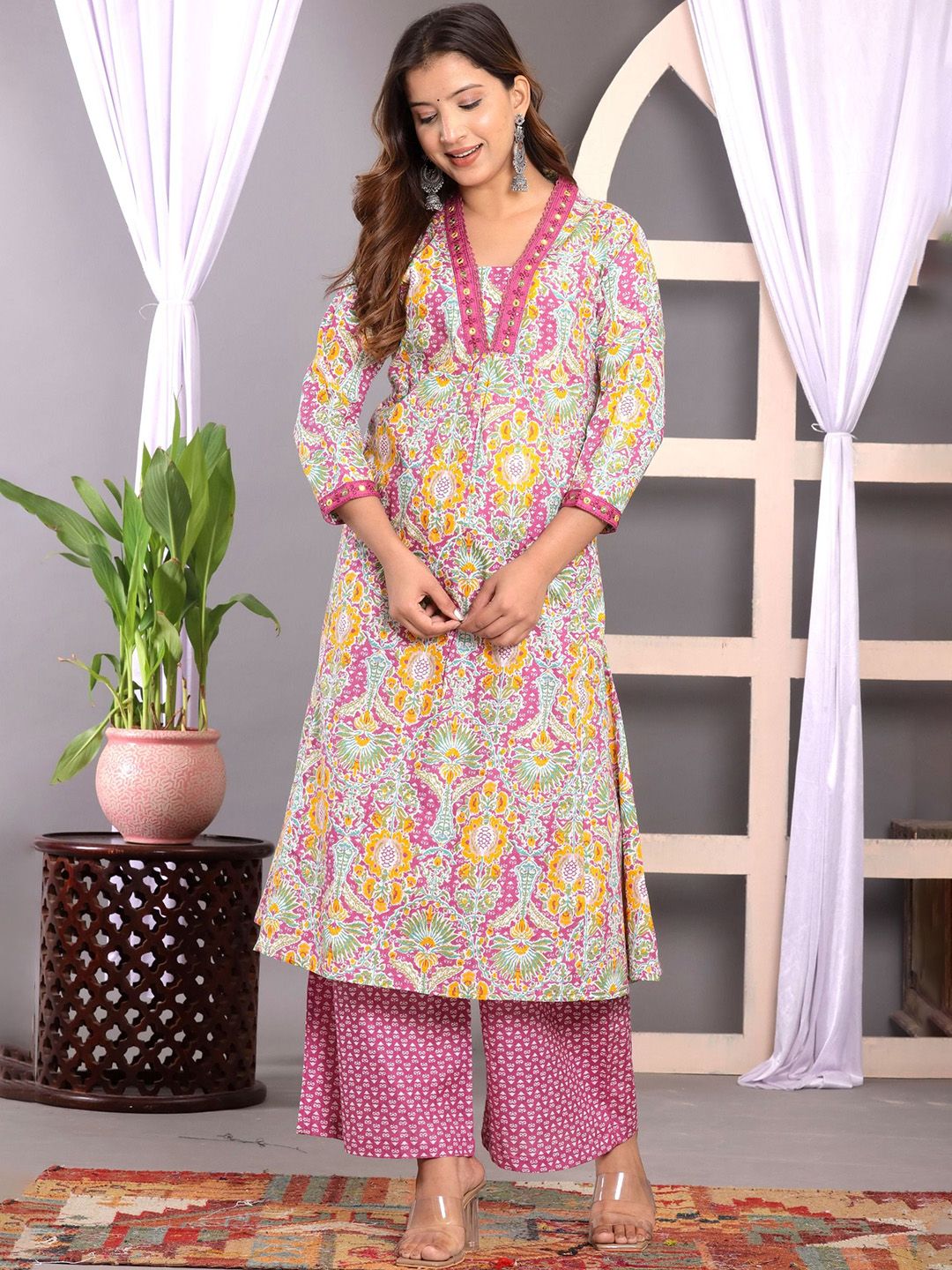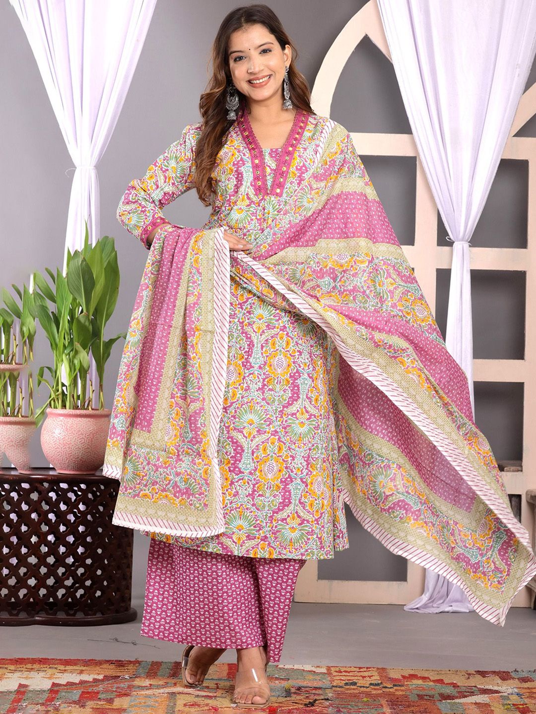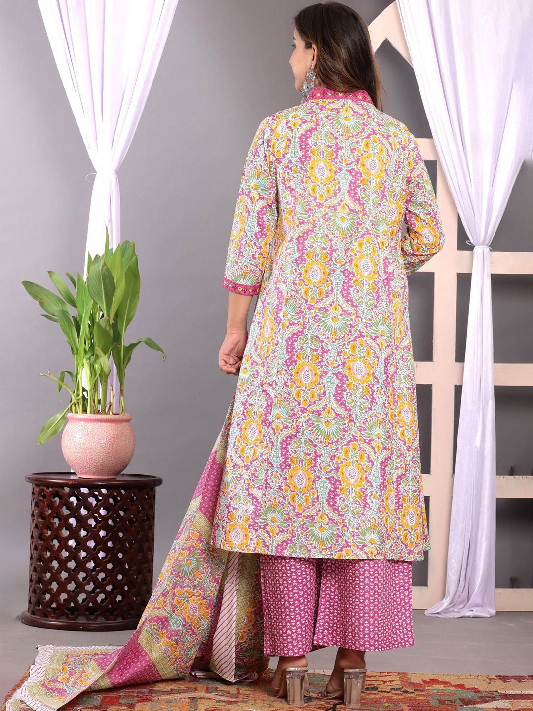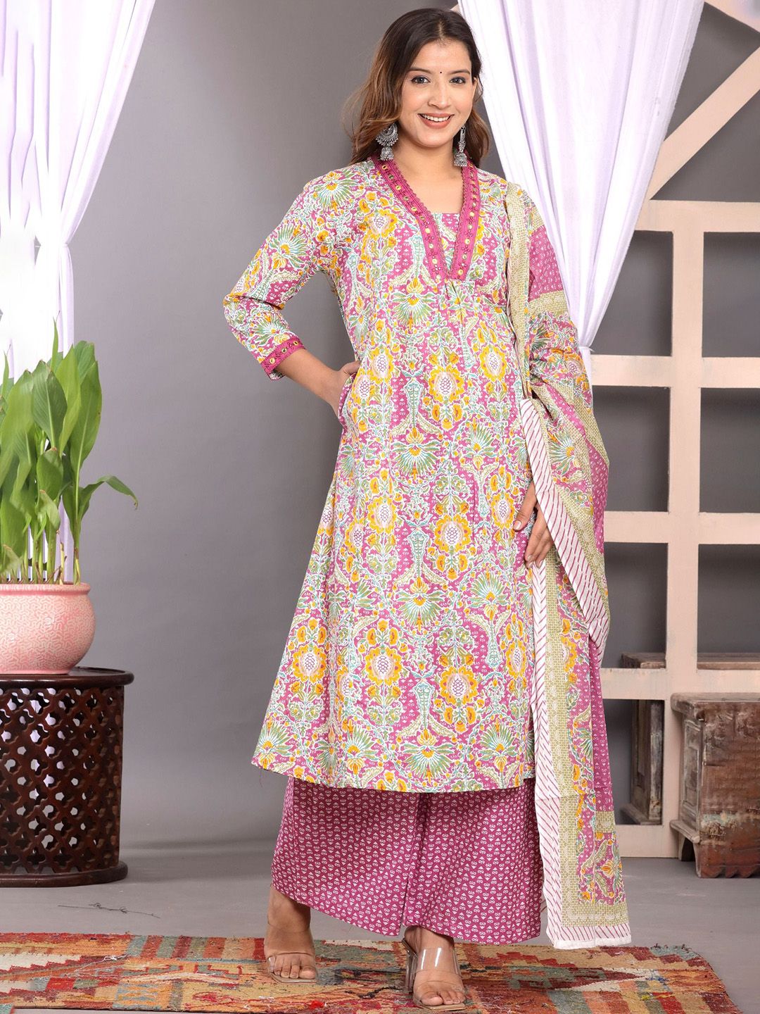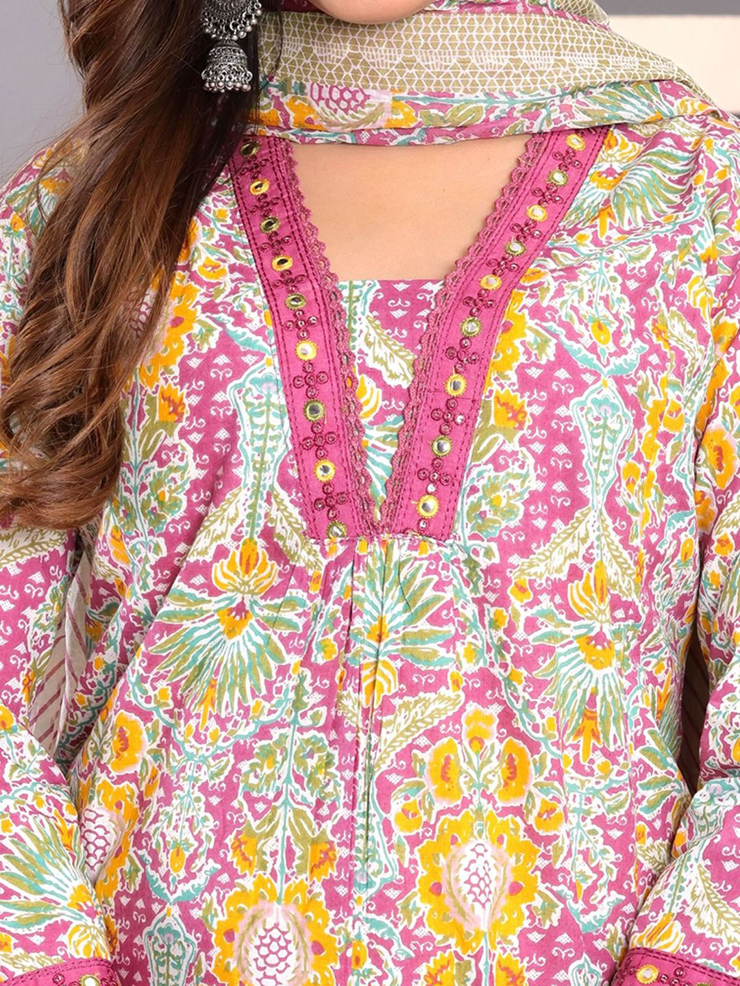 Women Floral Printed Cotton Kurta with Palazzos & Dupatta
