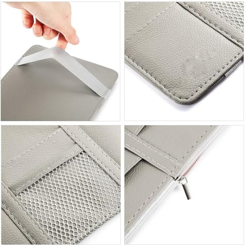 WZA Car Accessories Car Sun Visor Organizer, Sunglass Pen Card Small Document Storage Pouch Holder, PU Leather, Multi-Pocket with Zipper Net (Grey)
