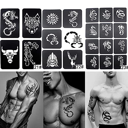 xmasir 22 Sheet Cool Drawing Glitter Tattoo Stencil for Men, Wolf Dragon Tiger Skull Animal Airbrush Stencils & Templates