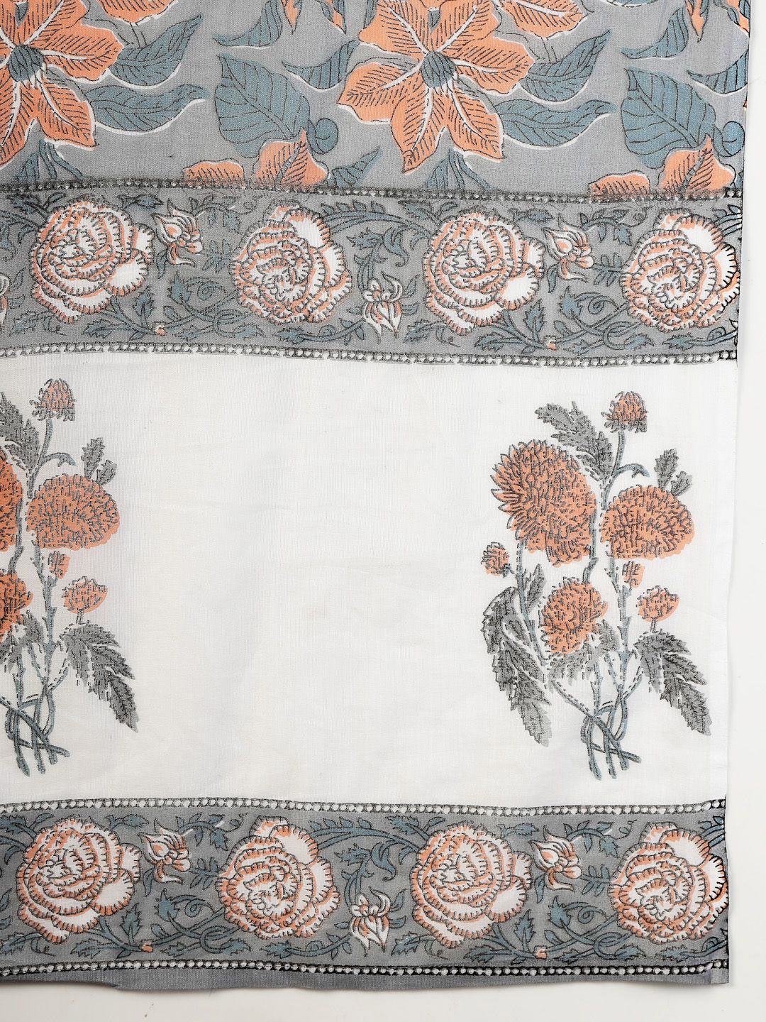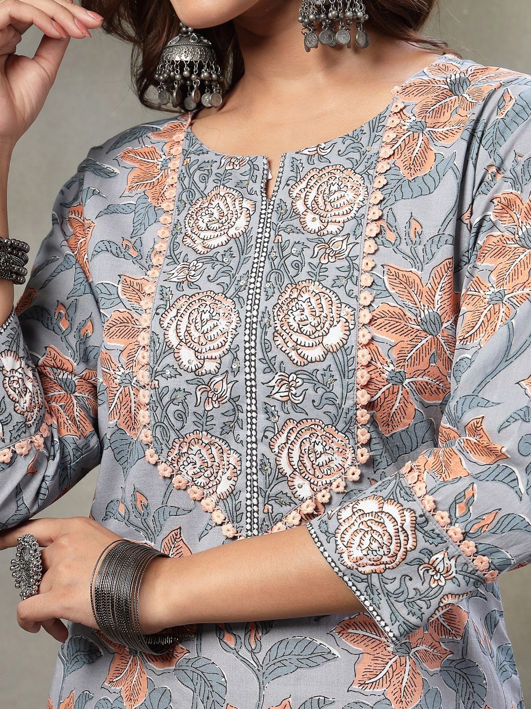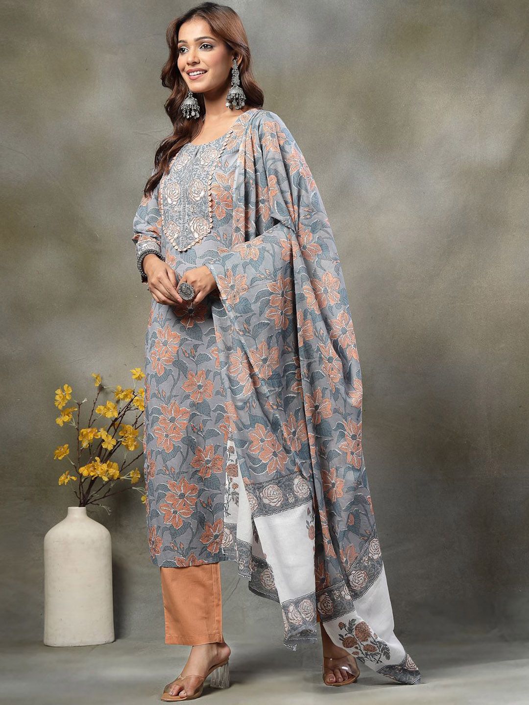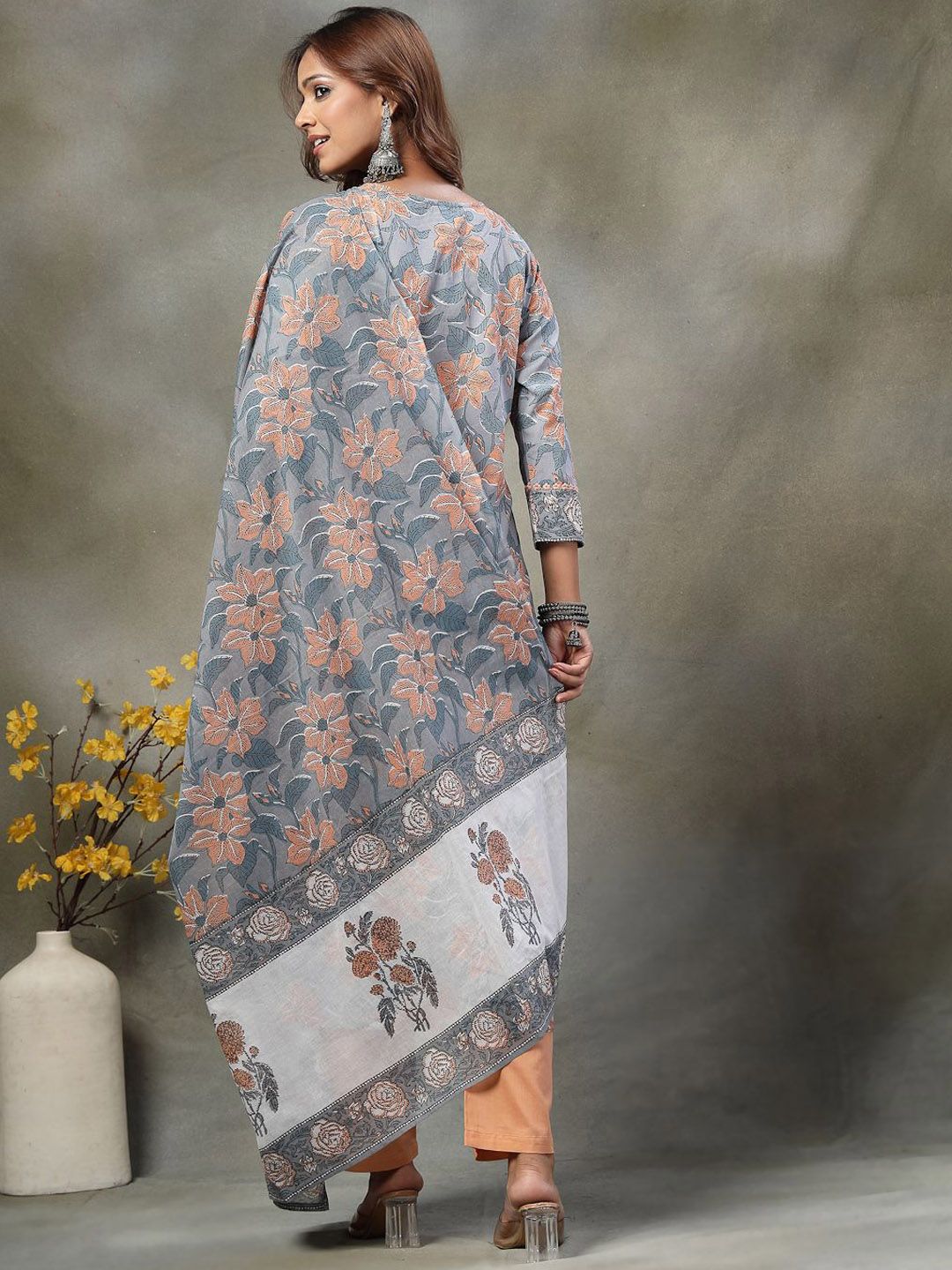 Yufta Floral Printed Kantha Work Pure Cotton Kurta With Trousers & Dupatta