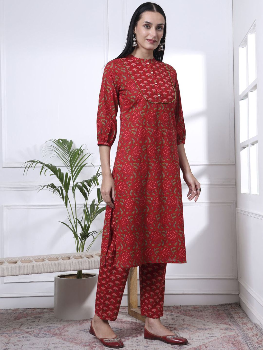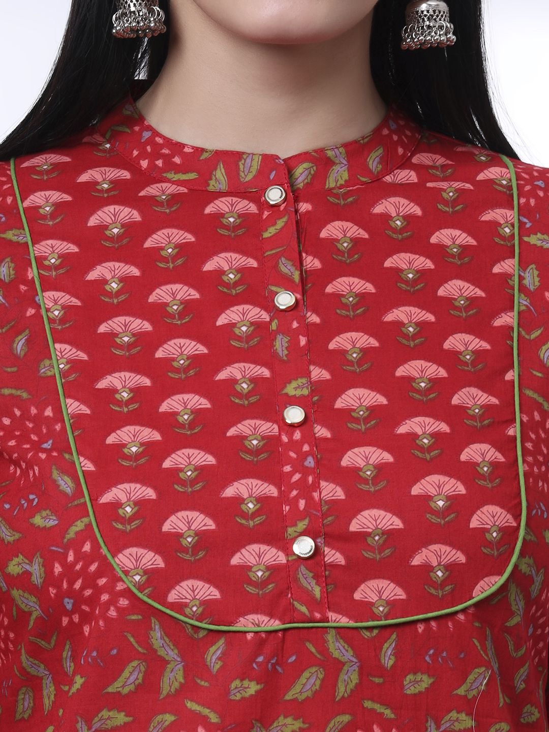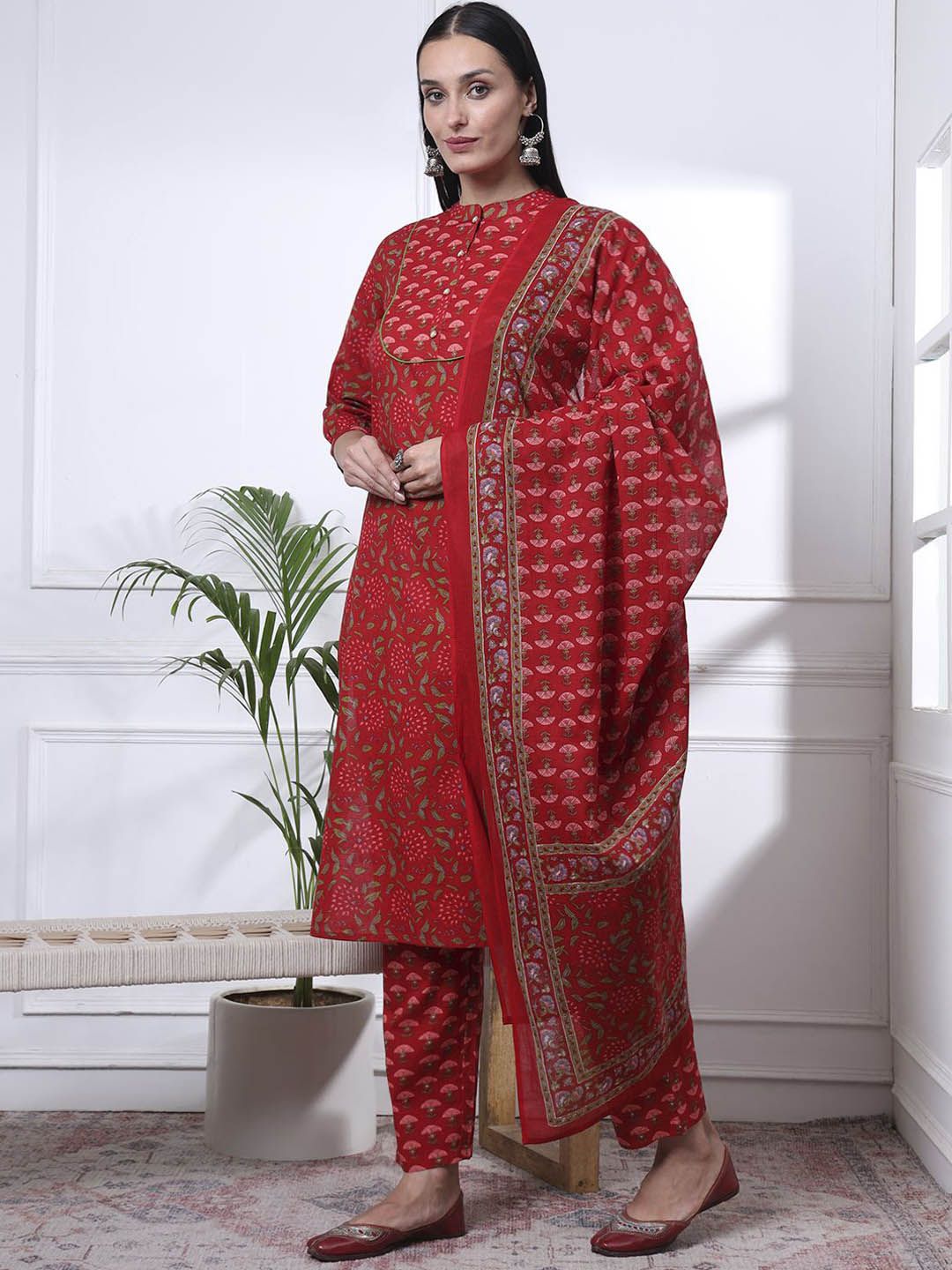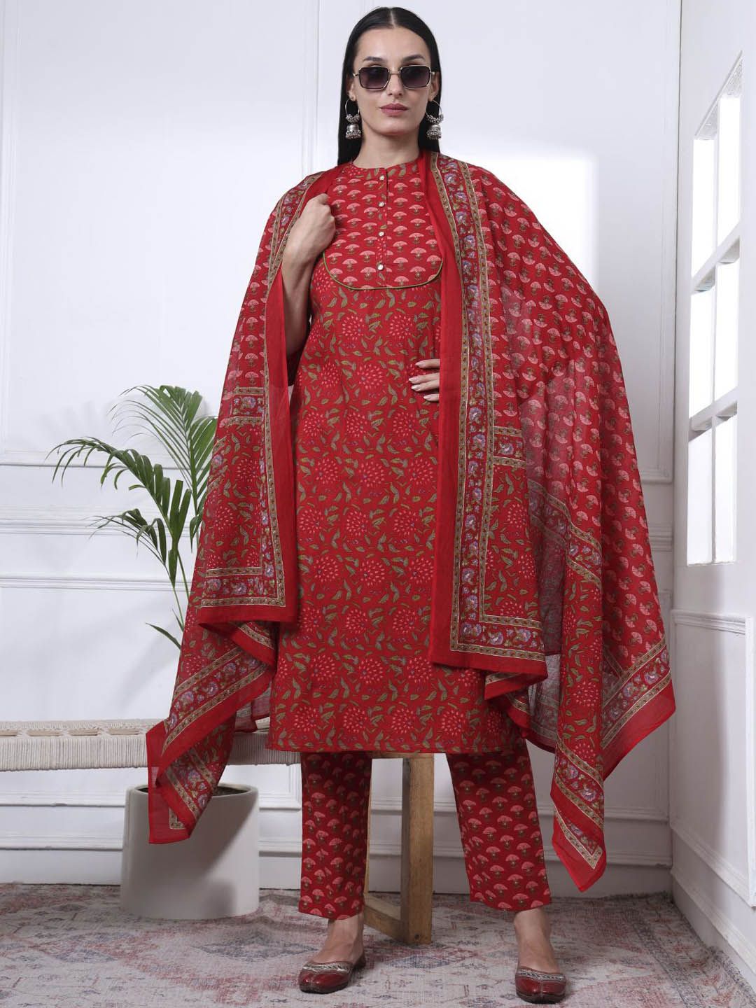 Yufta Floral Printed Mandarin Collar Pure Cotton Kurta With Trousers & Dupatta