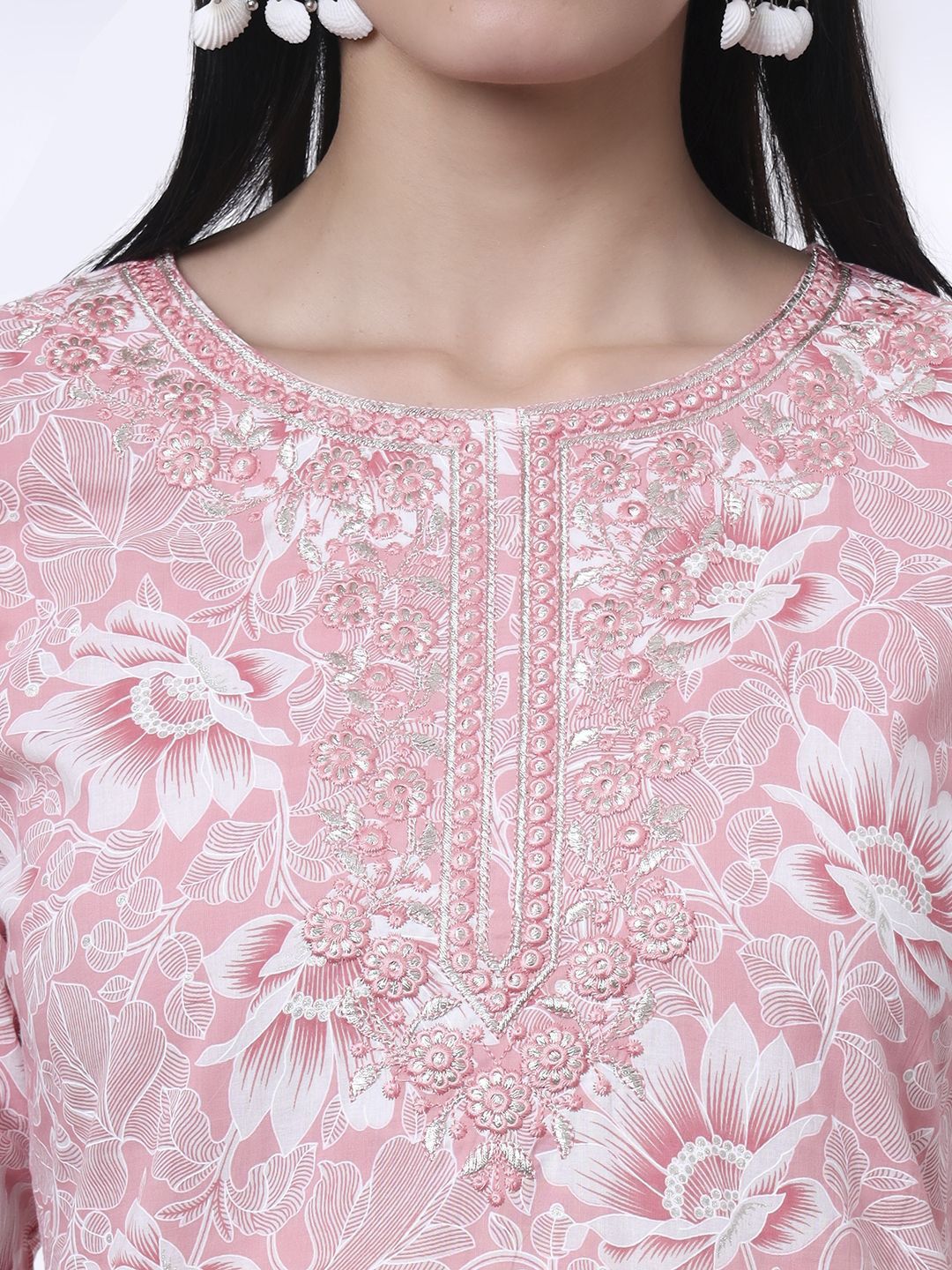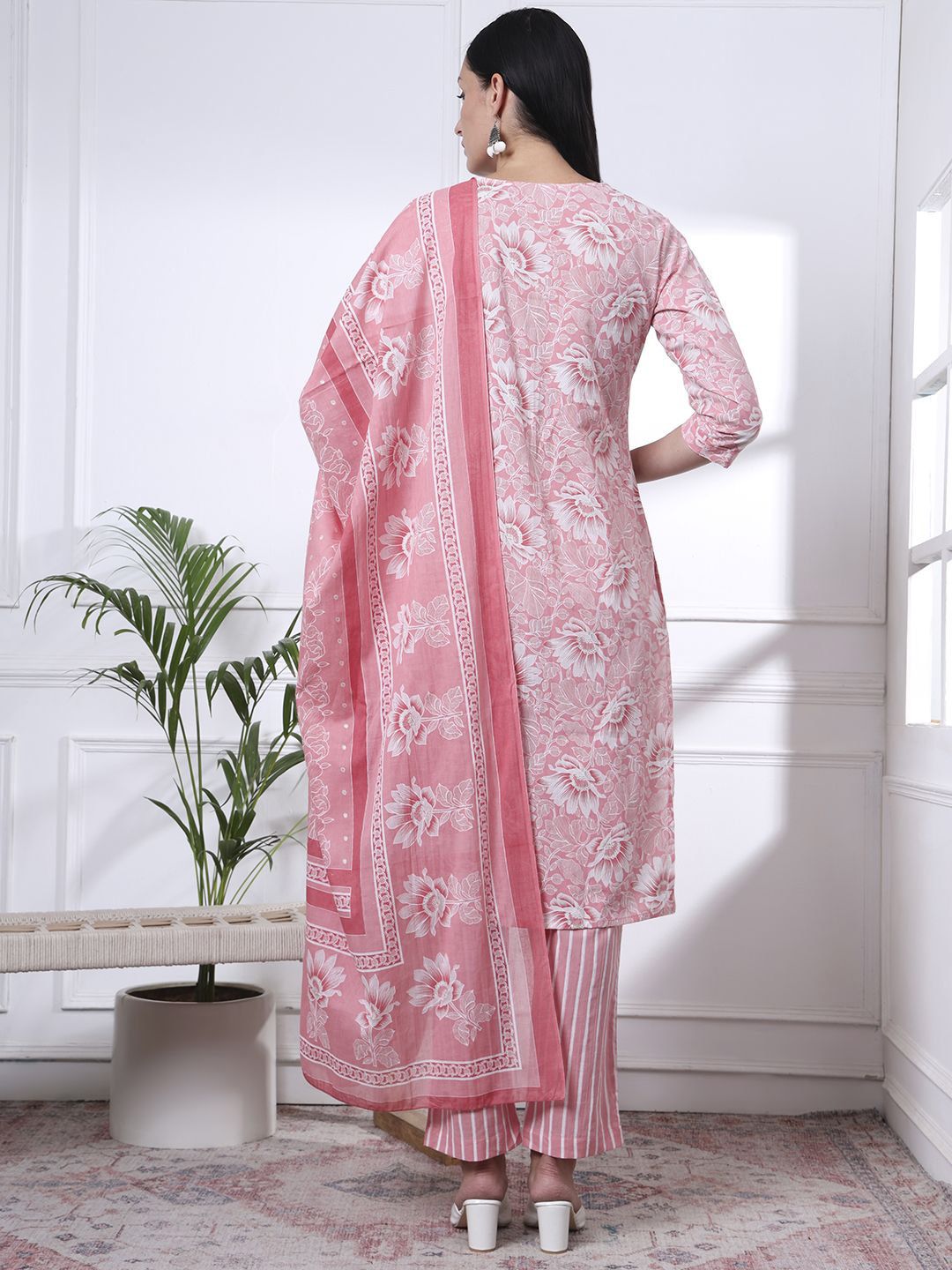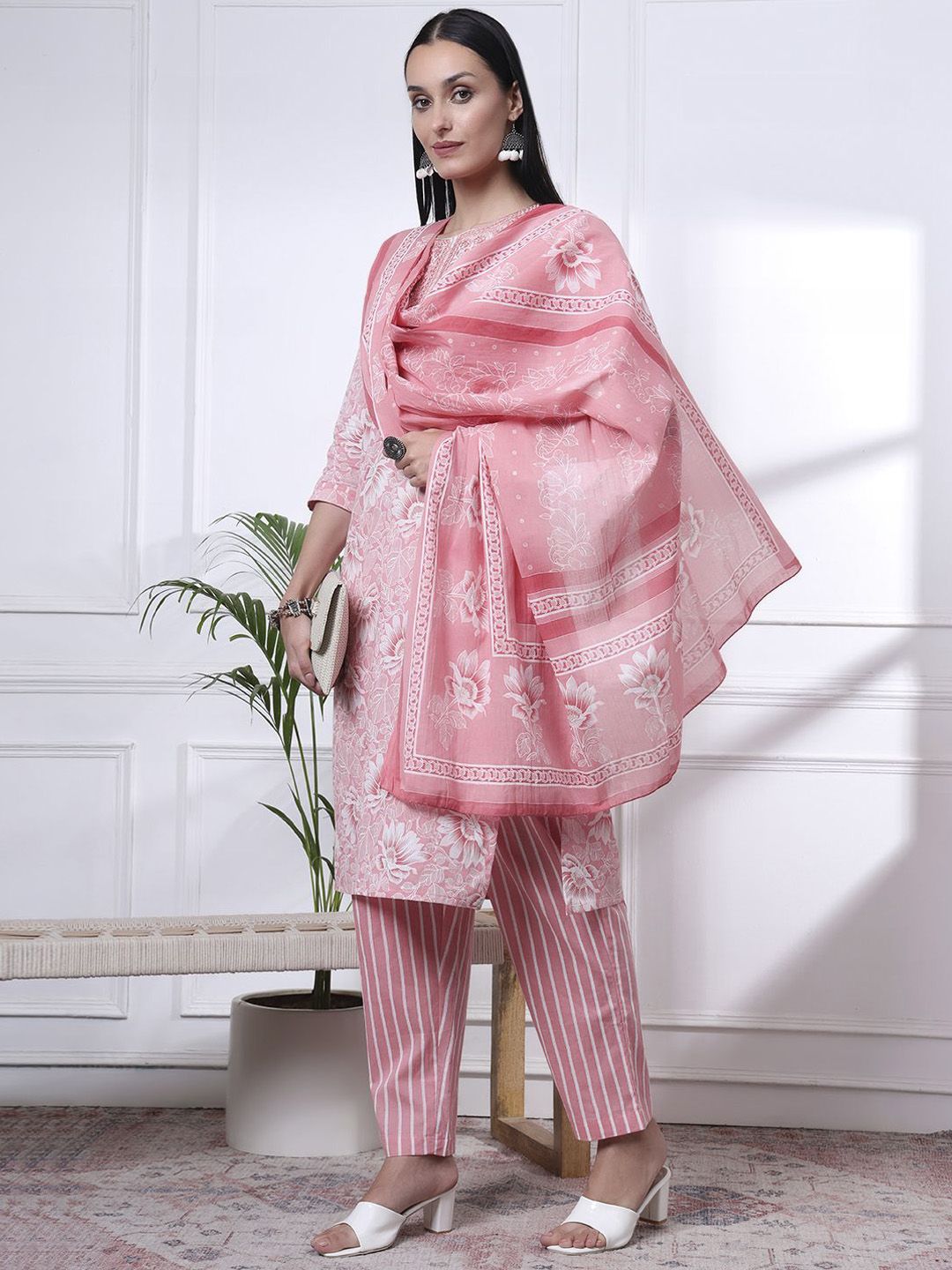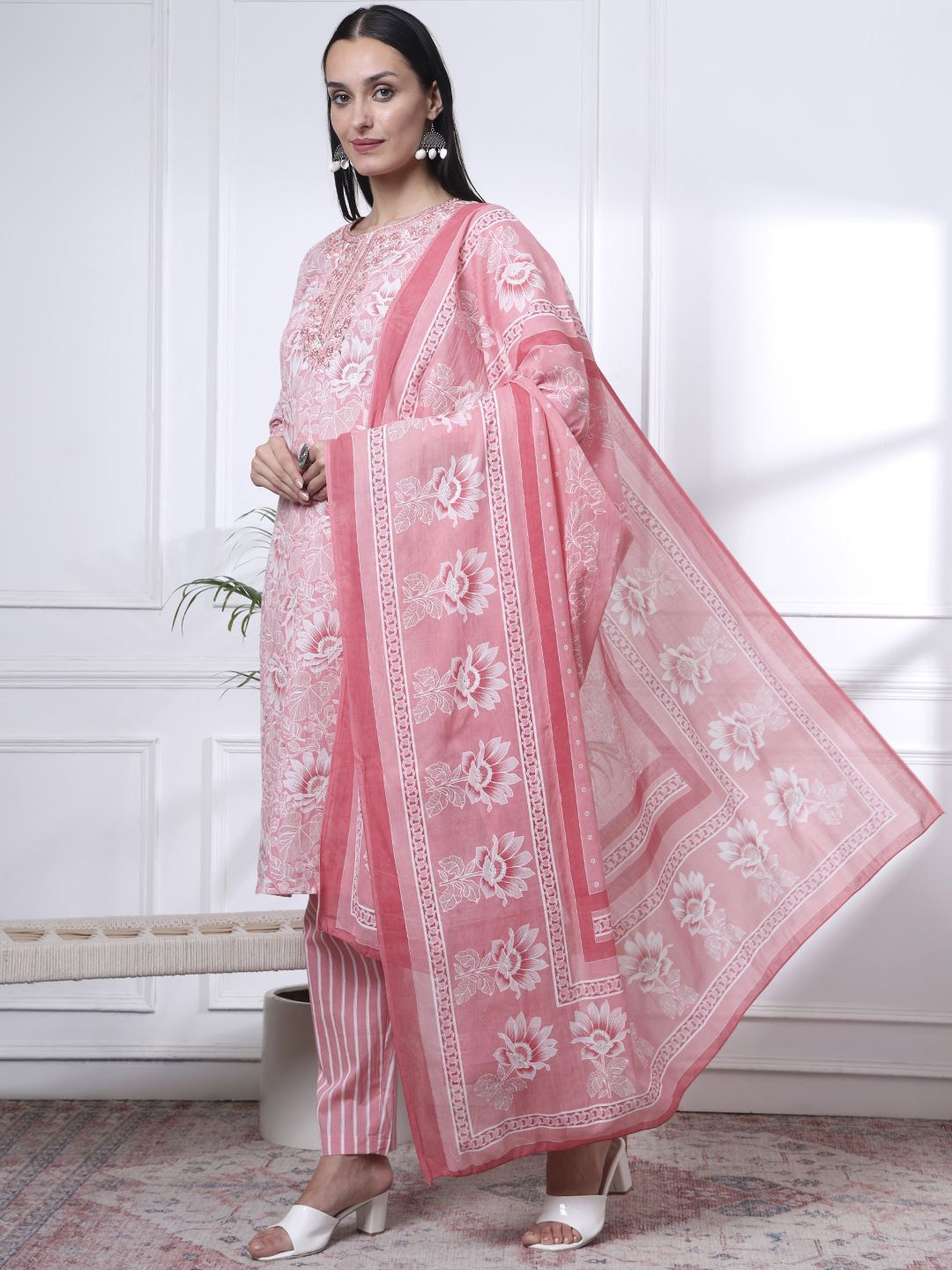 Yufta Floral Printed Pure Cotton Kurta With Trousers & Dupatta