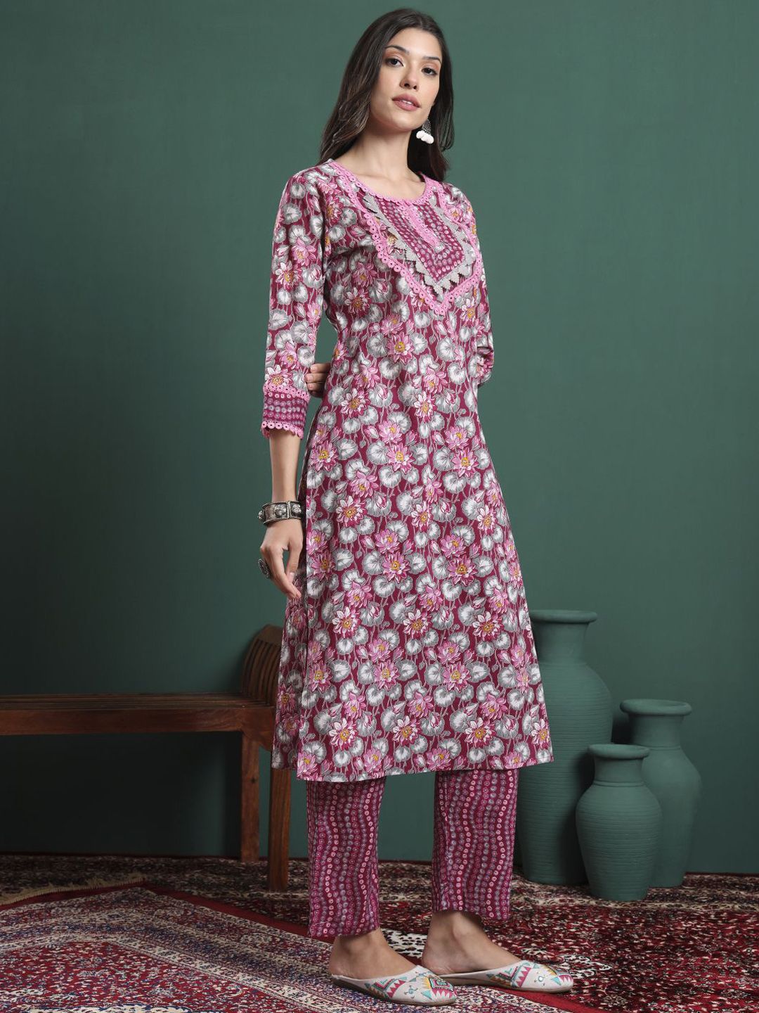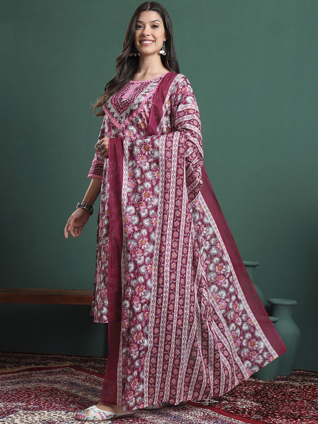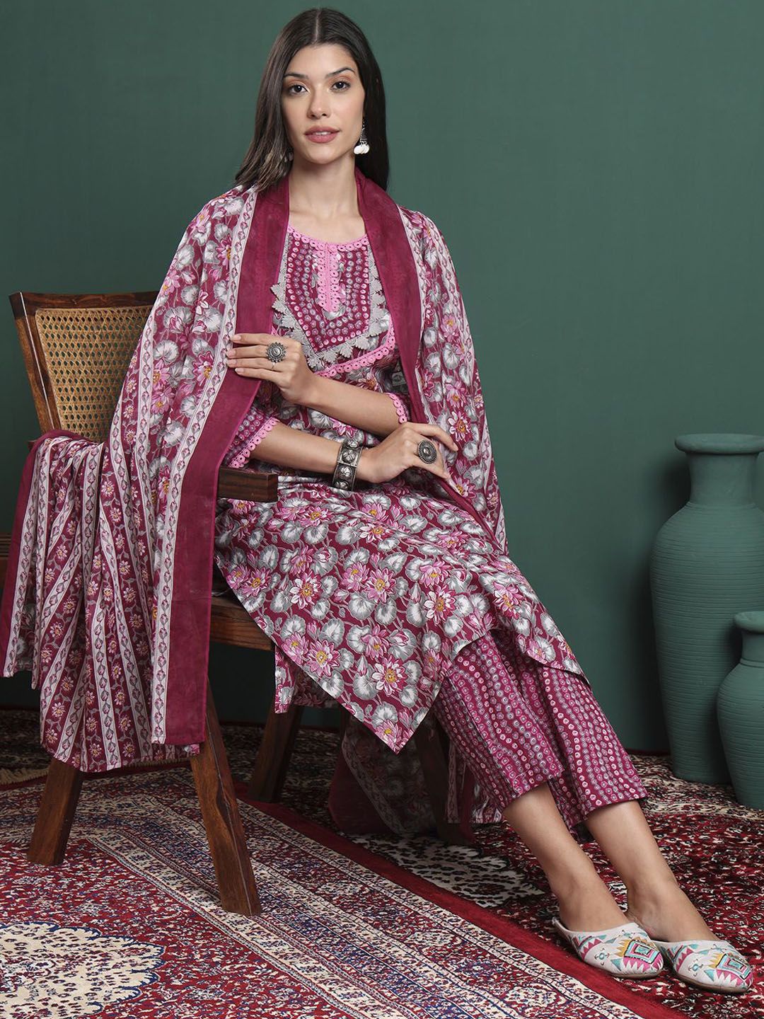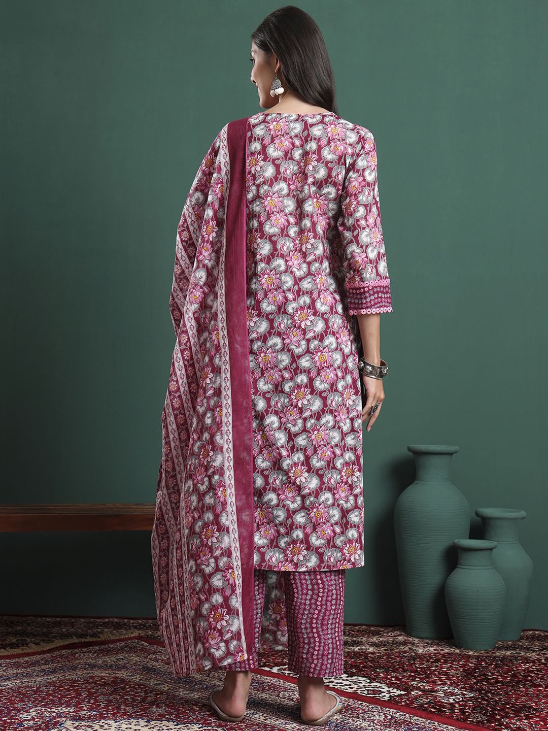 Yufta Floral Printed Pure Cotton Straight Kurta With Trousers & Dupatta