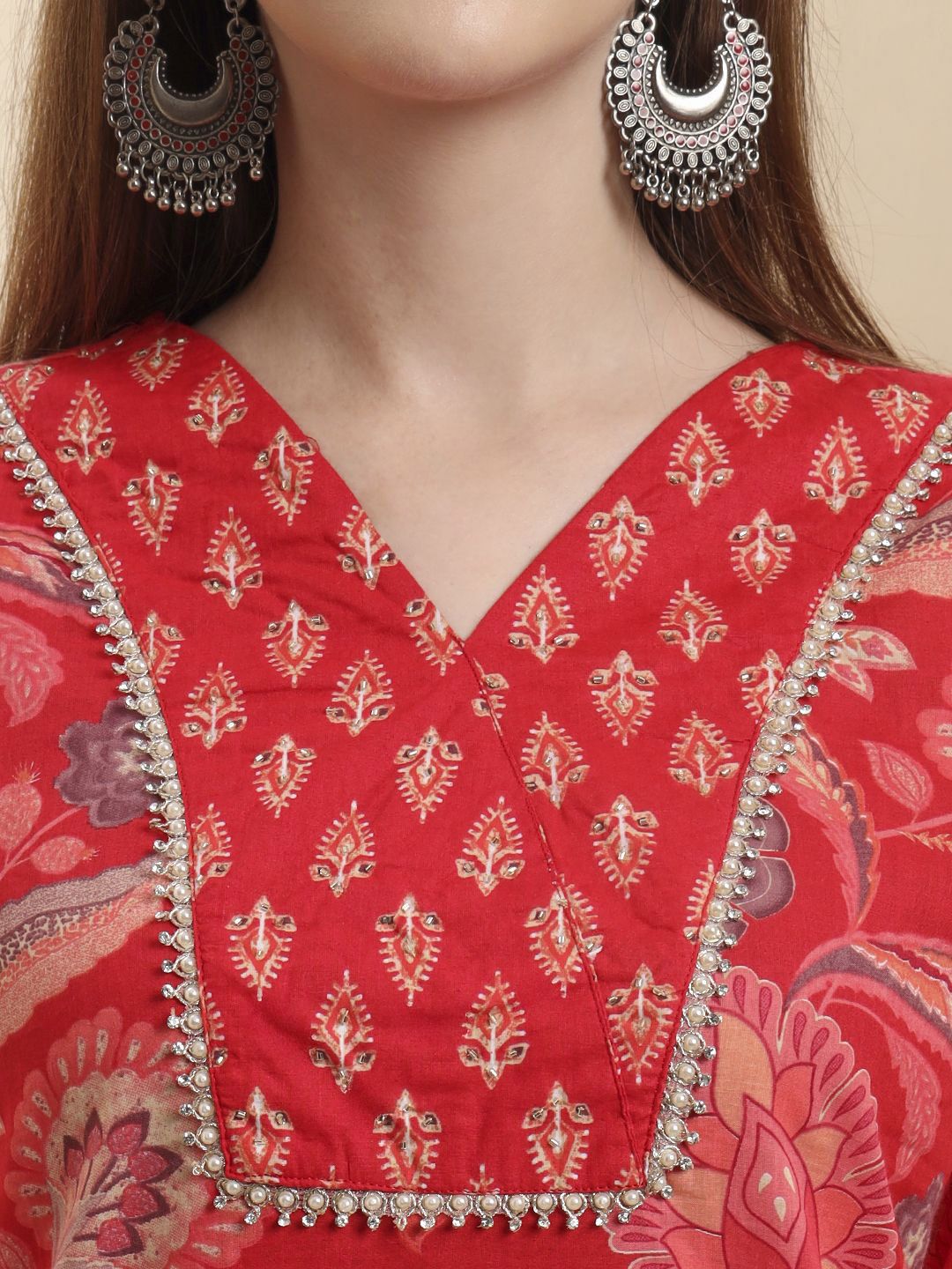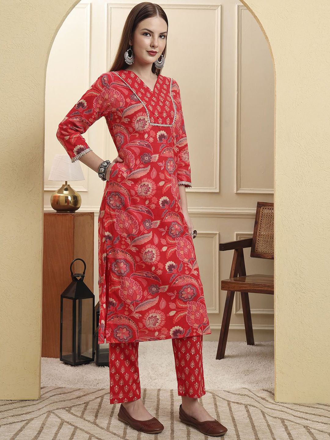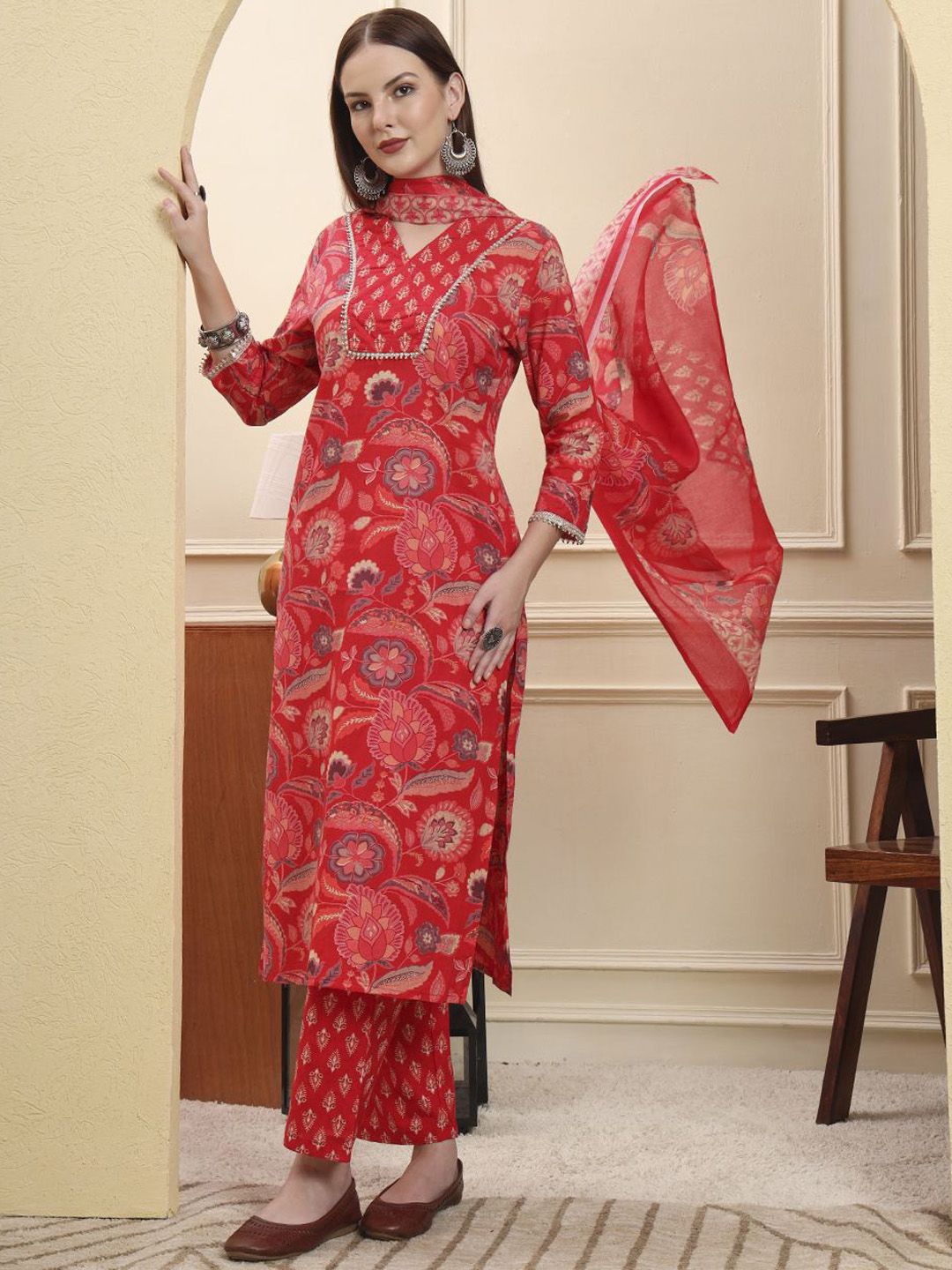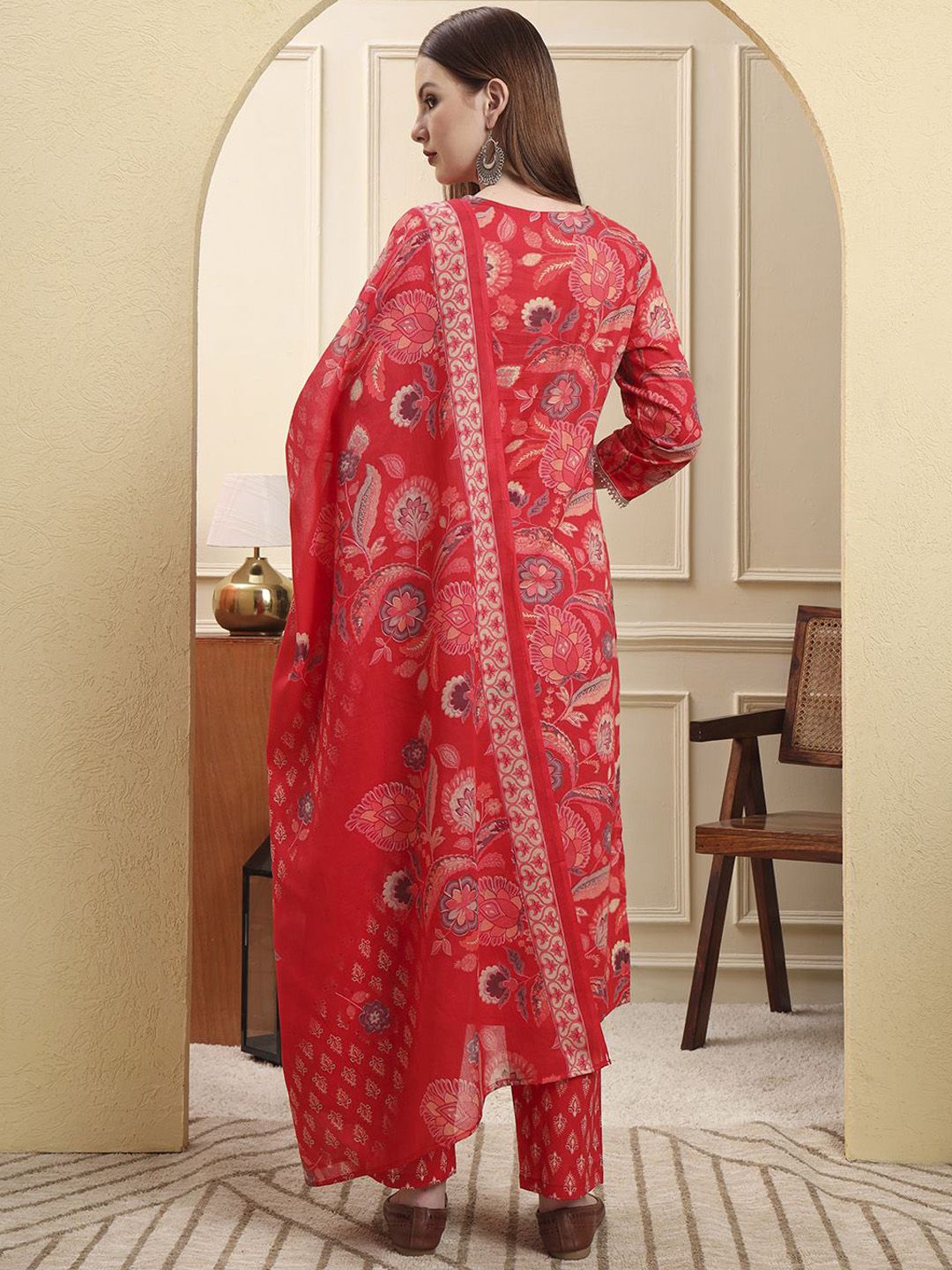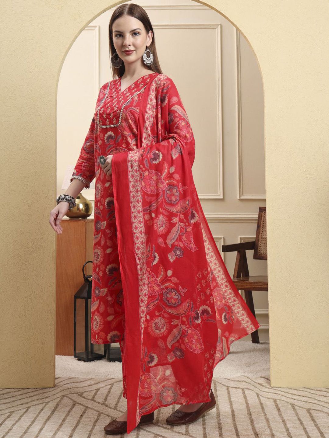 Yufta Floral Printed Pure Cotton V-Neck Straight Kurta With Trousers & Dupatta