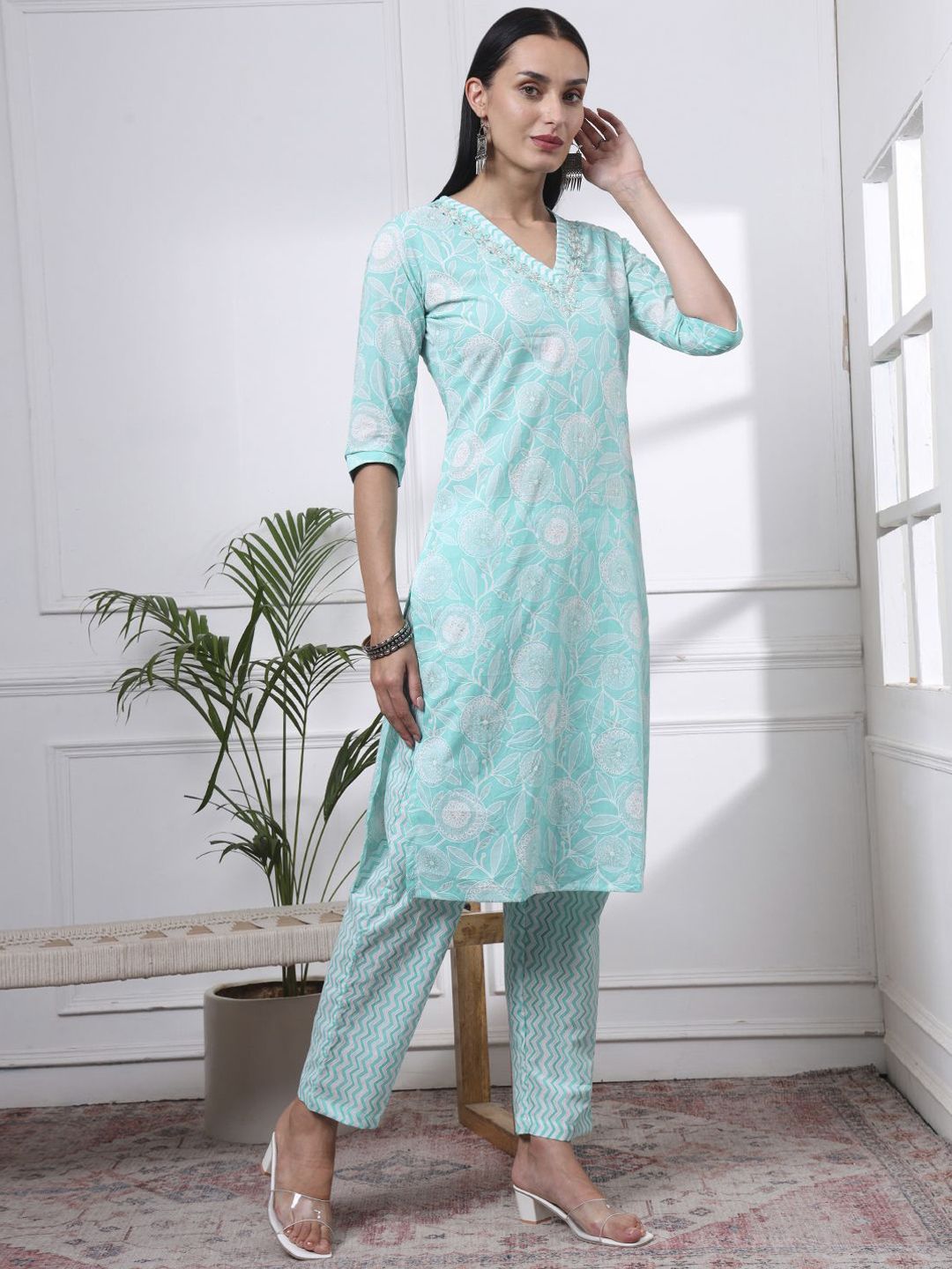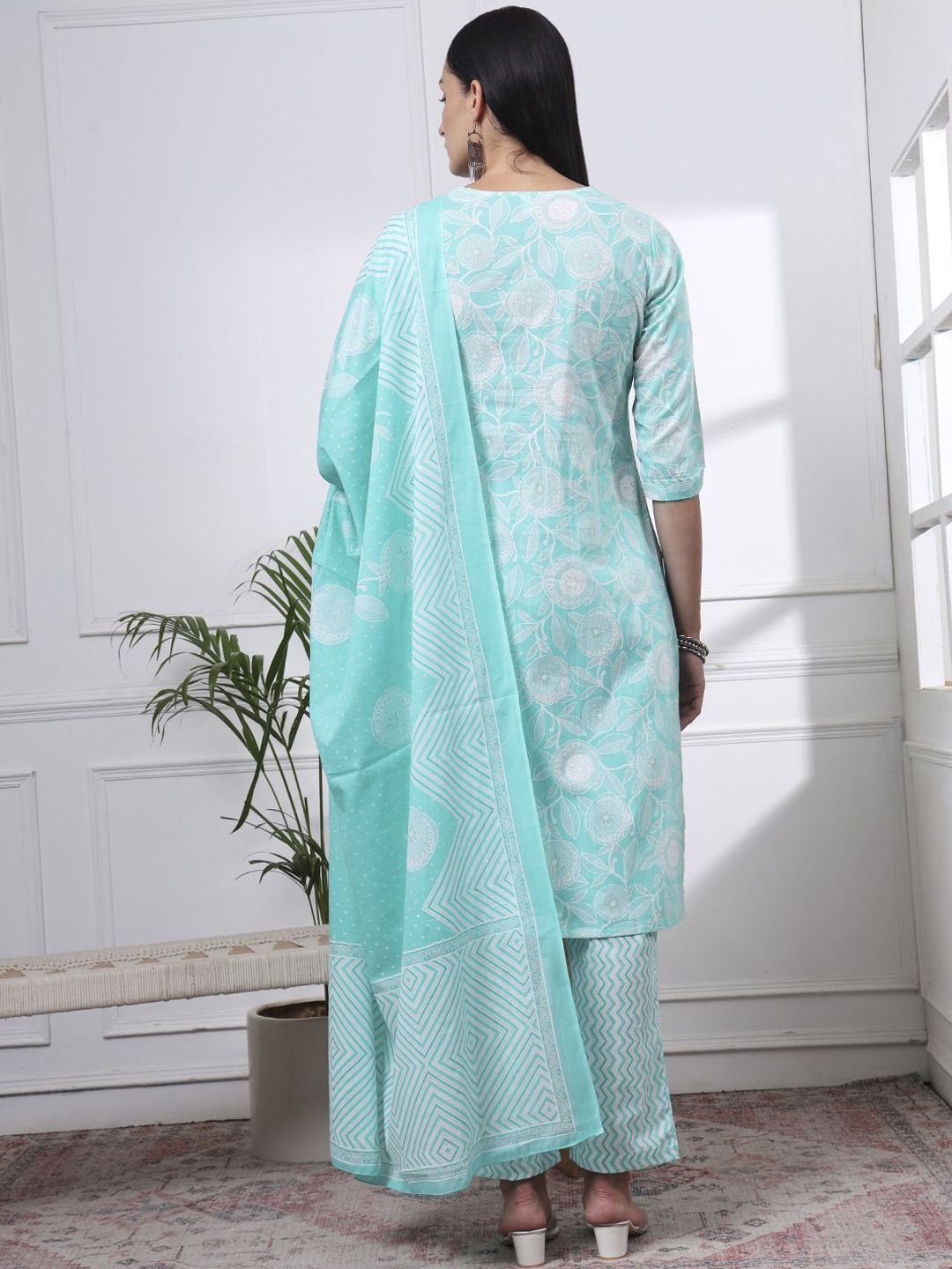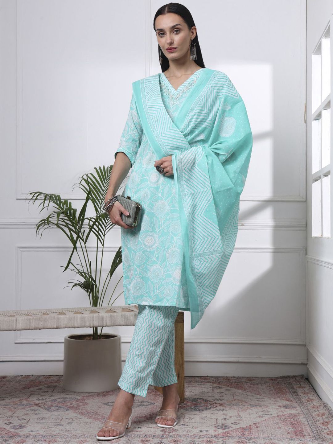Yufta Women Floral Embroidered V-Neck Pure Cotton Kurta with Trousers & Dupatta