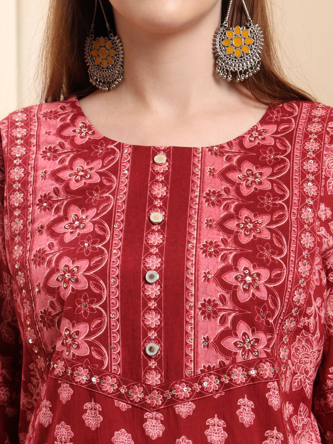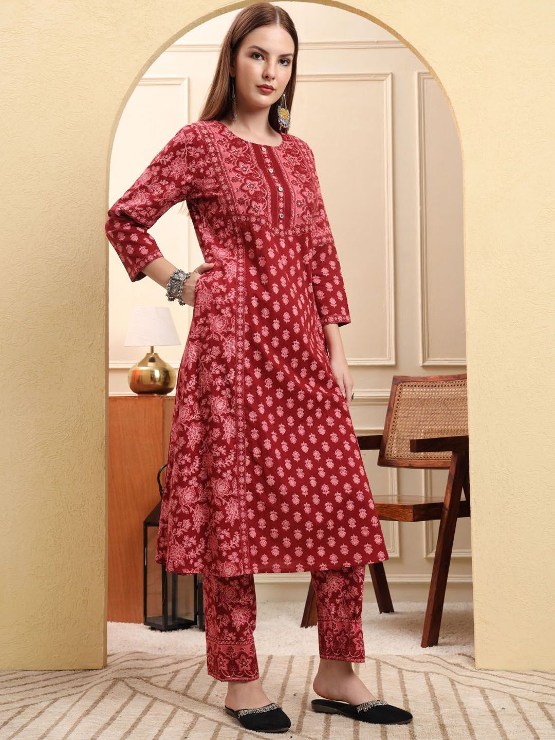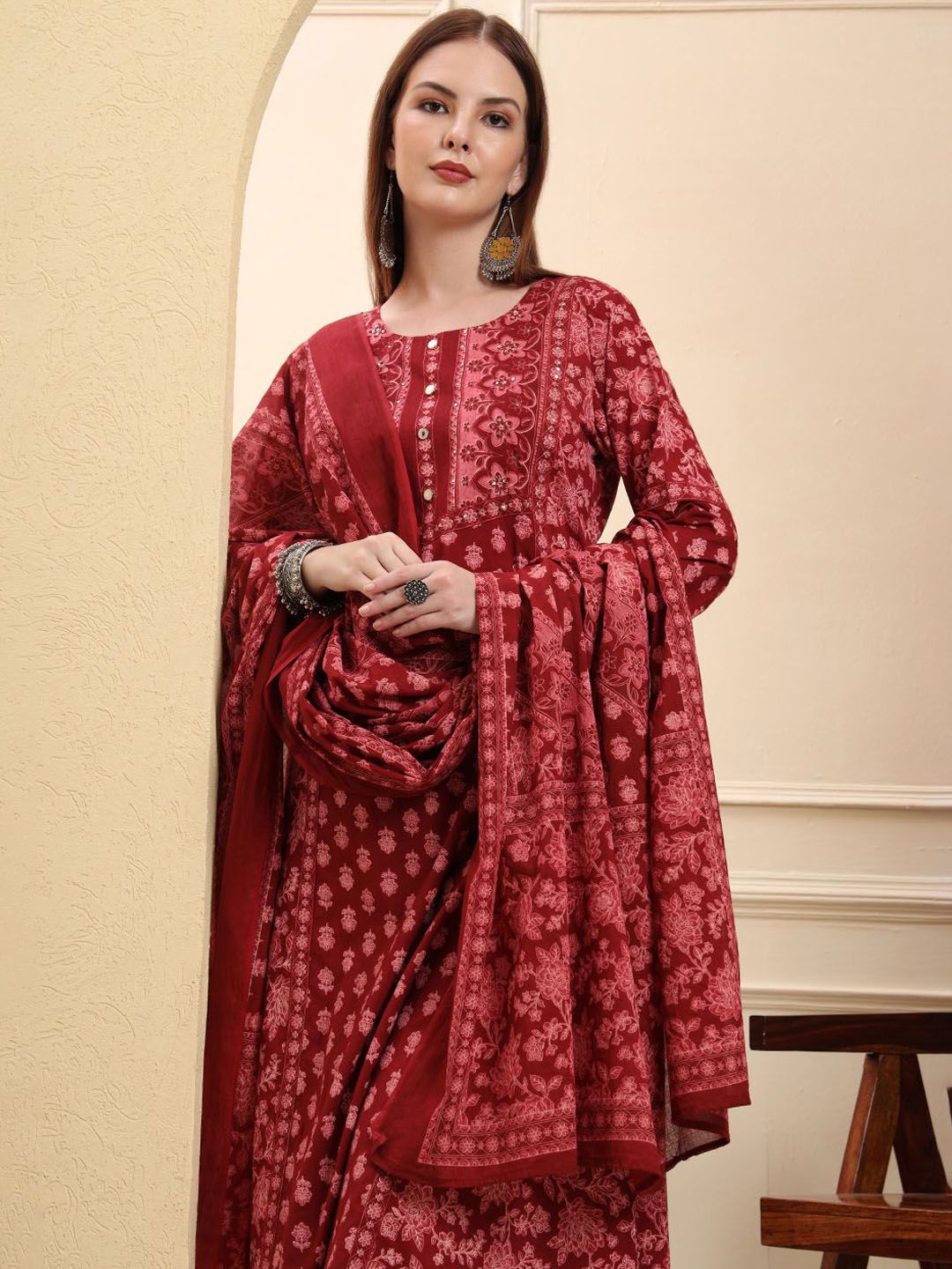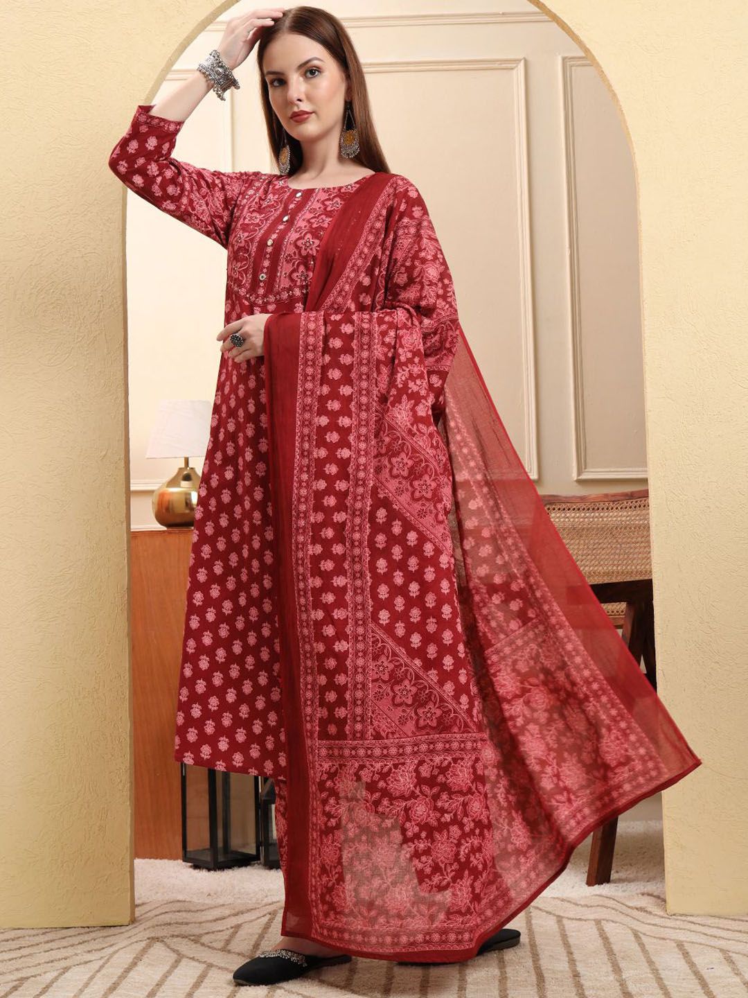 Yufta Women Floral Printed Cotton A-Line Kurta with Trousers & Dupatta