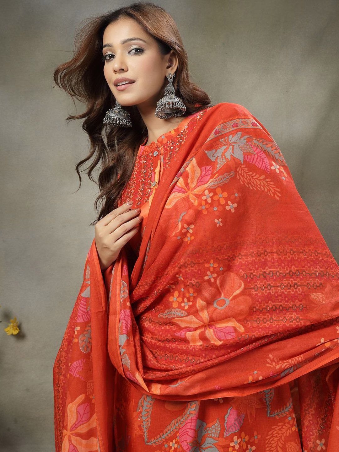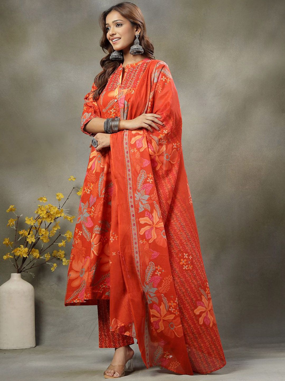 Yufta Women Floral Printed Cotton Kurta with Churidar & Dupatta