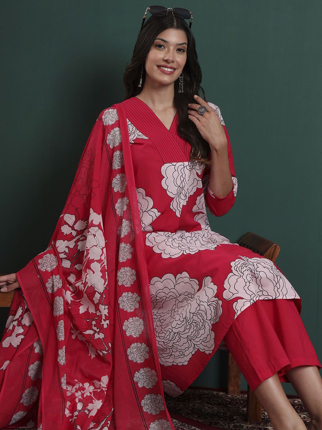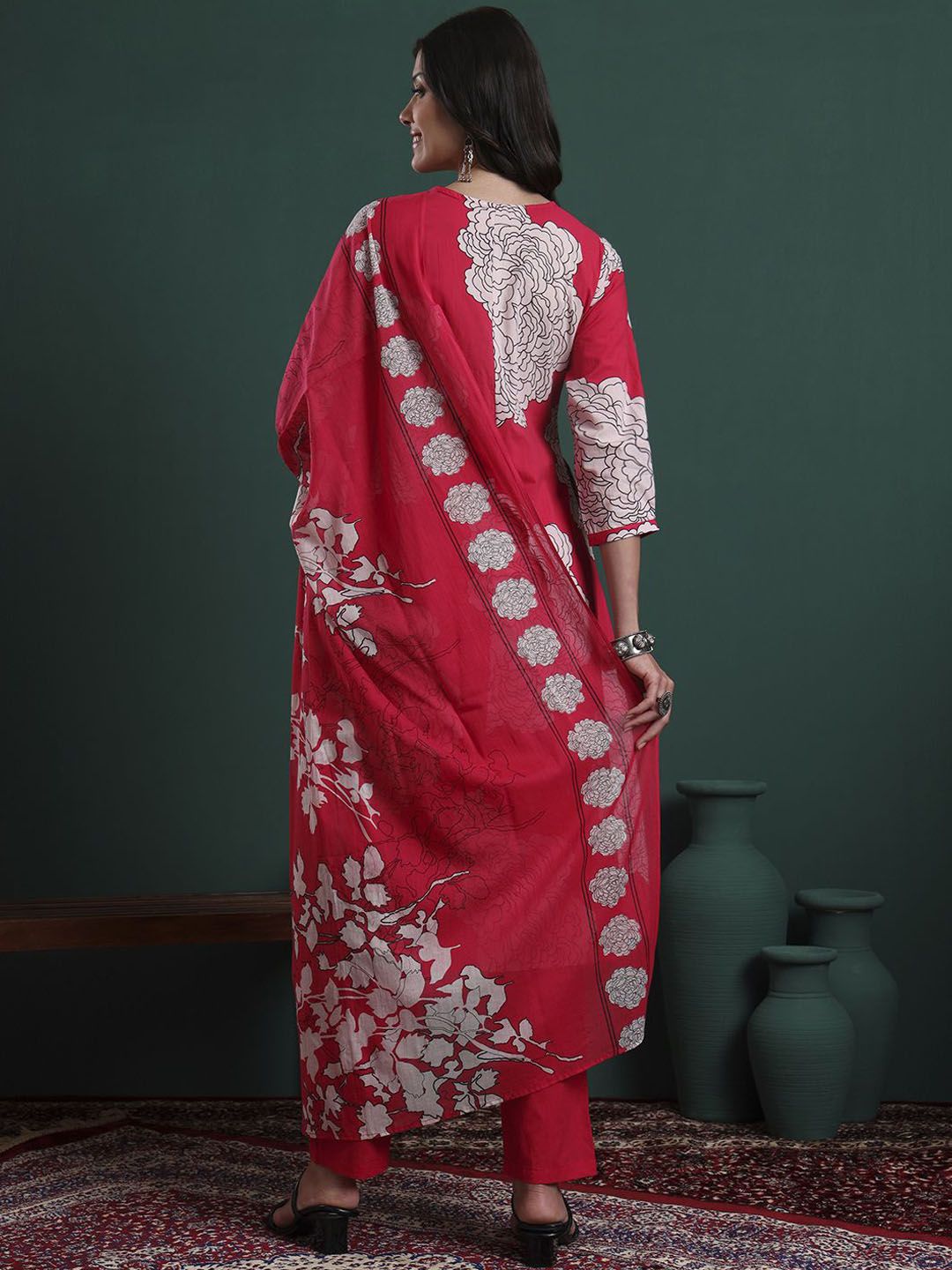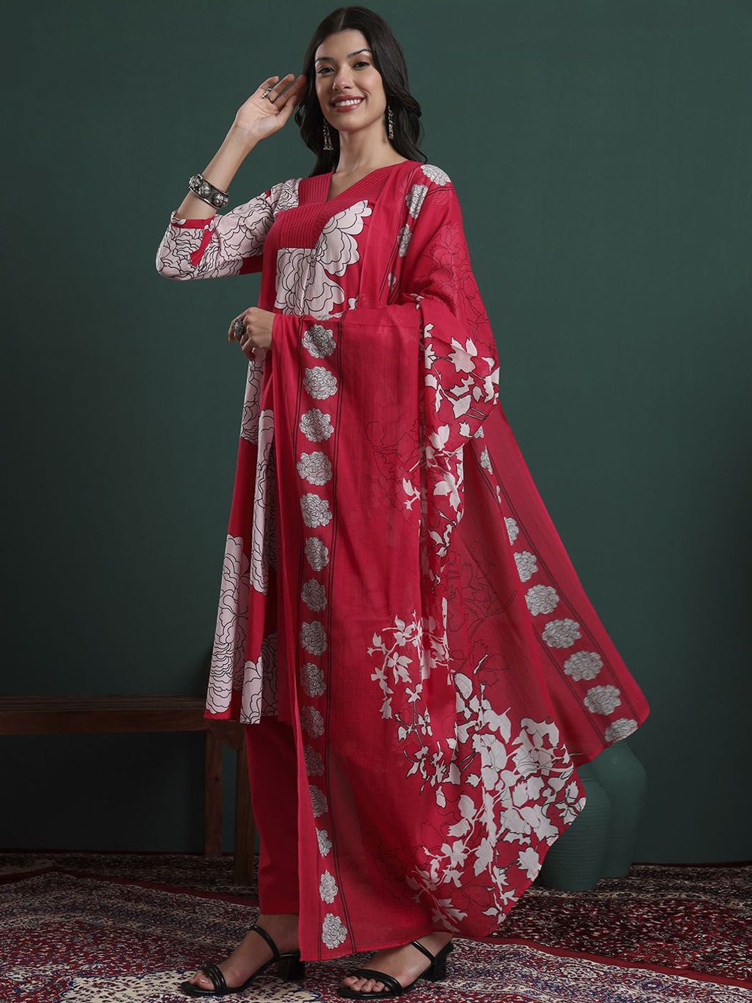 Yufta Women Floral Printed Pure Cotton Kurta with Trousers & Dupatta