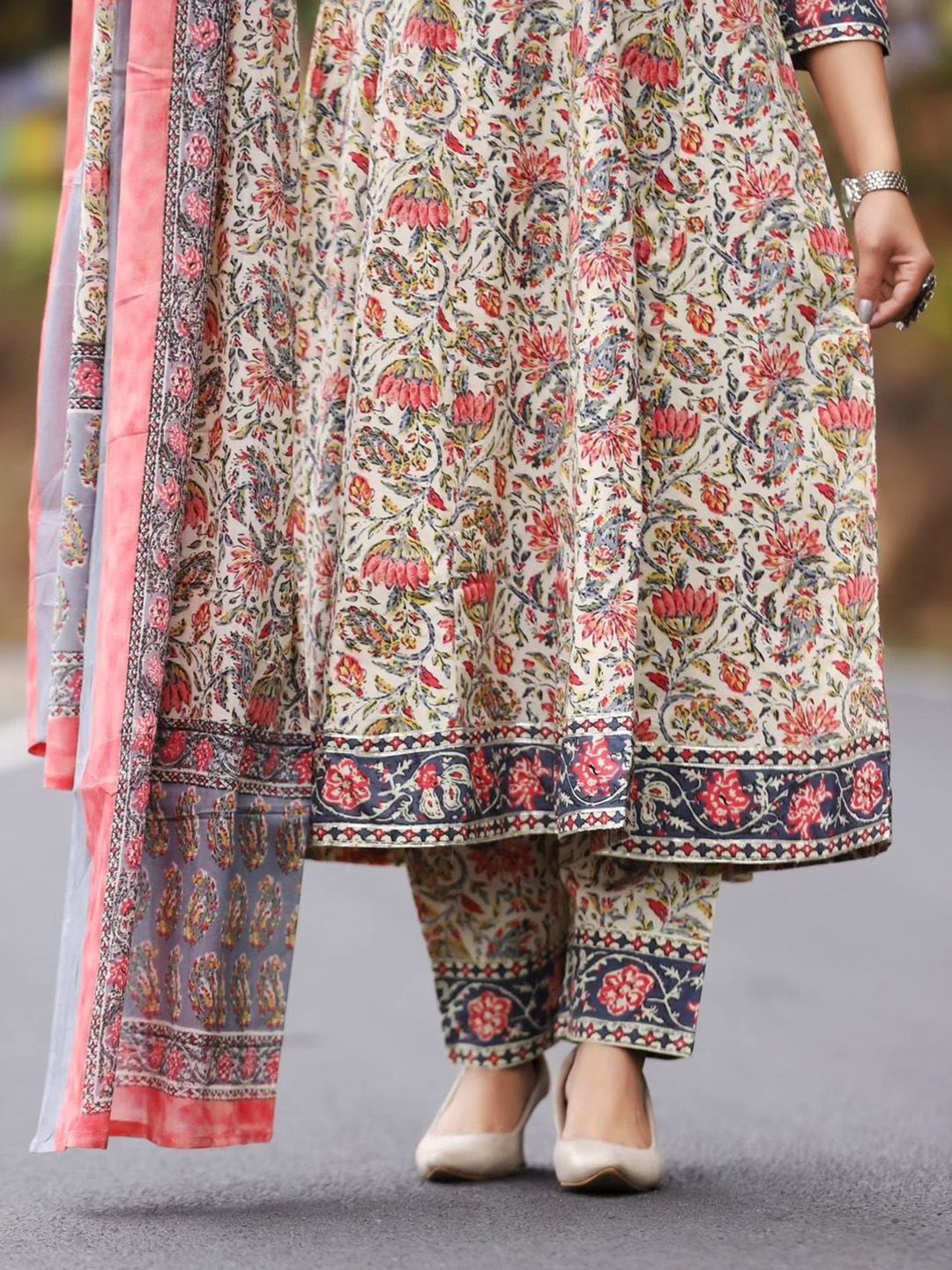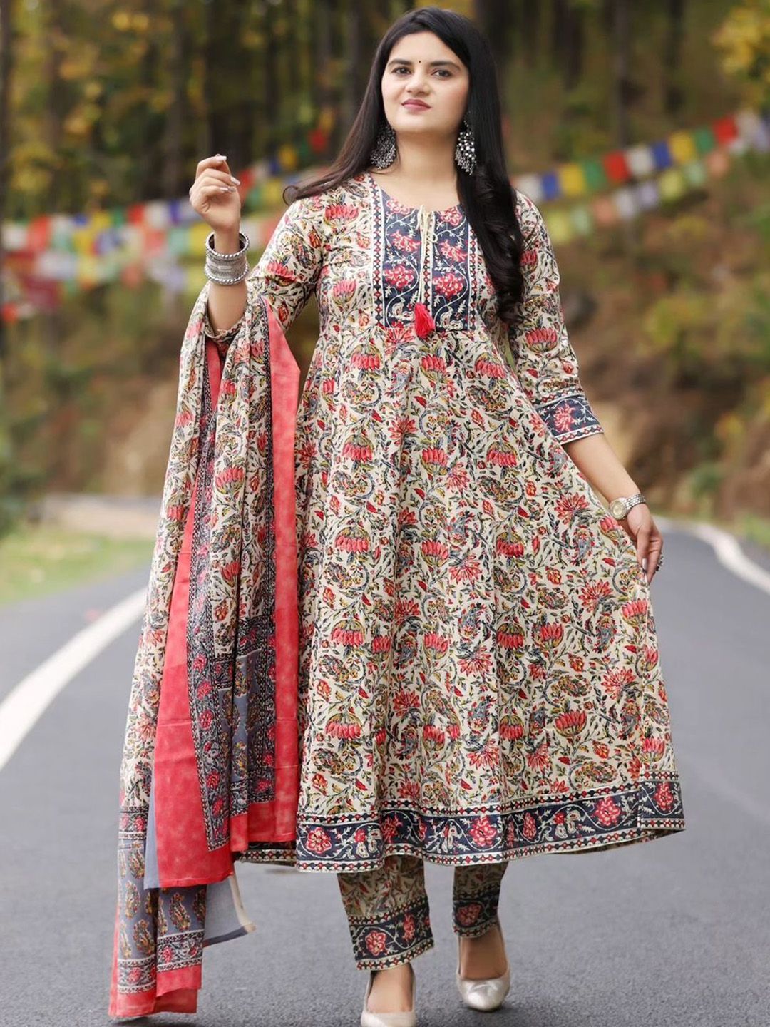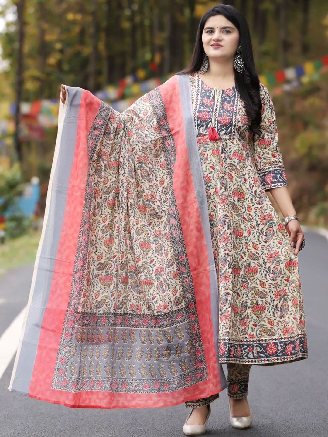 YUSRA Floral Printed Round Neck A-LIne Kurta With Trousers & Dupatta