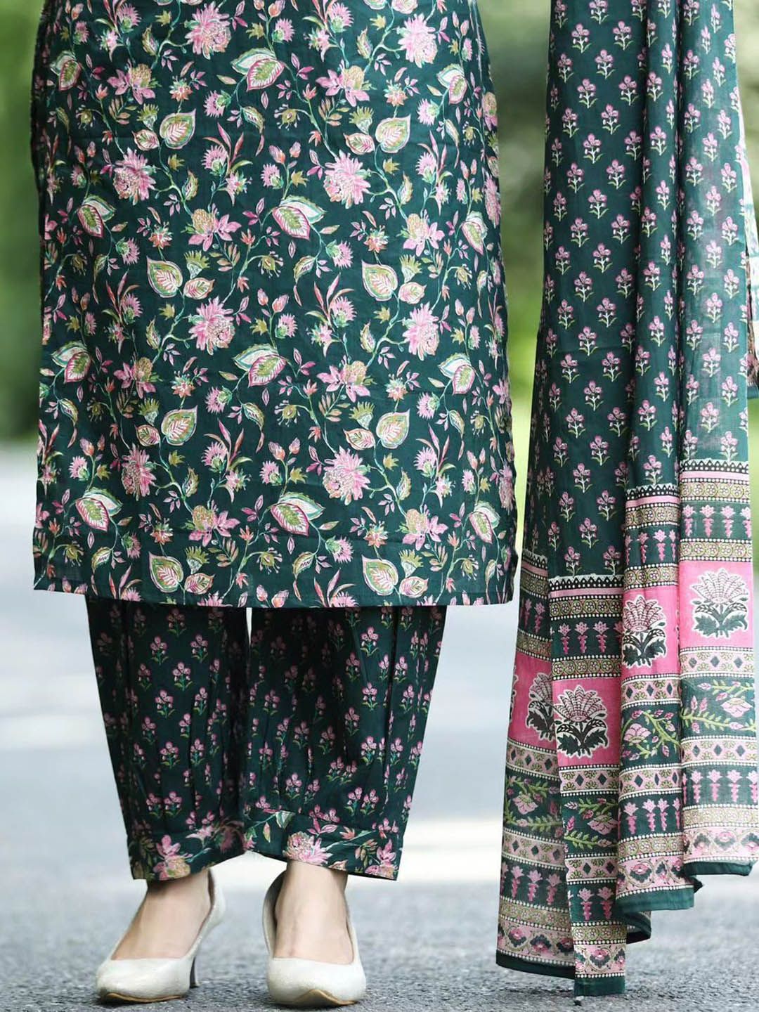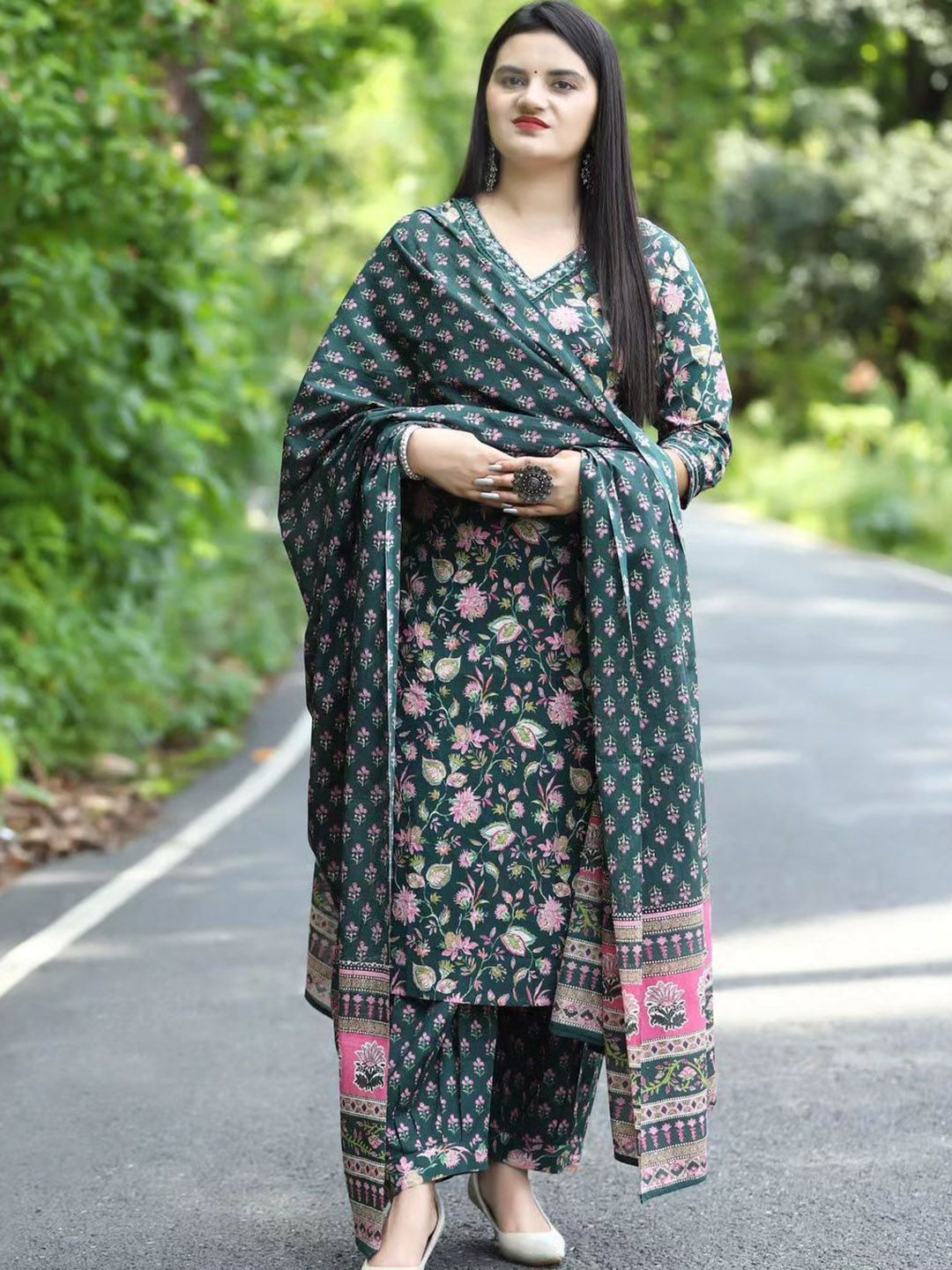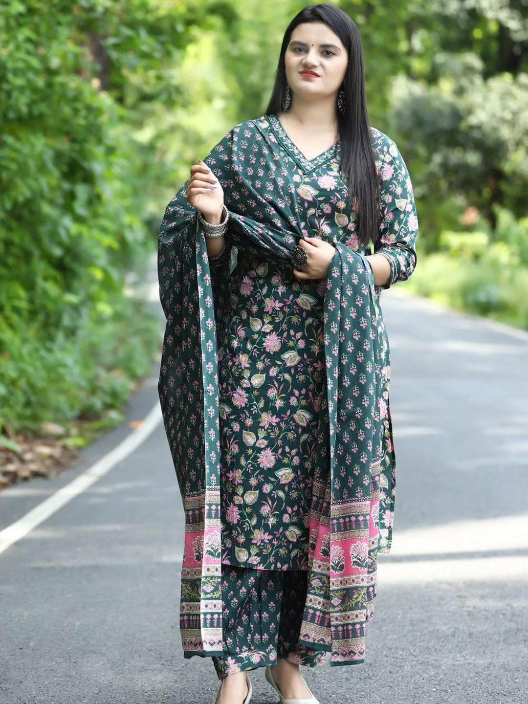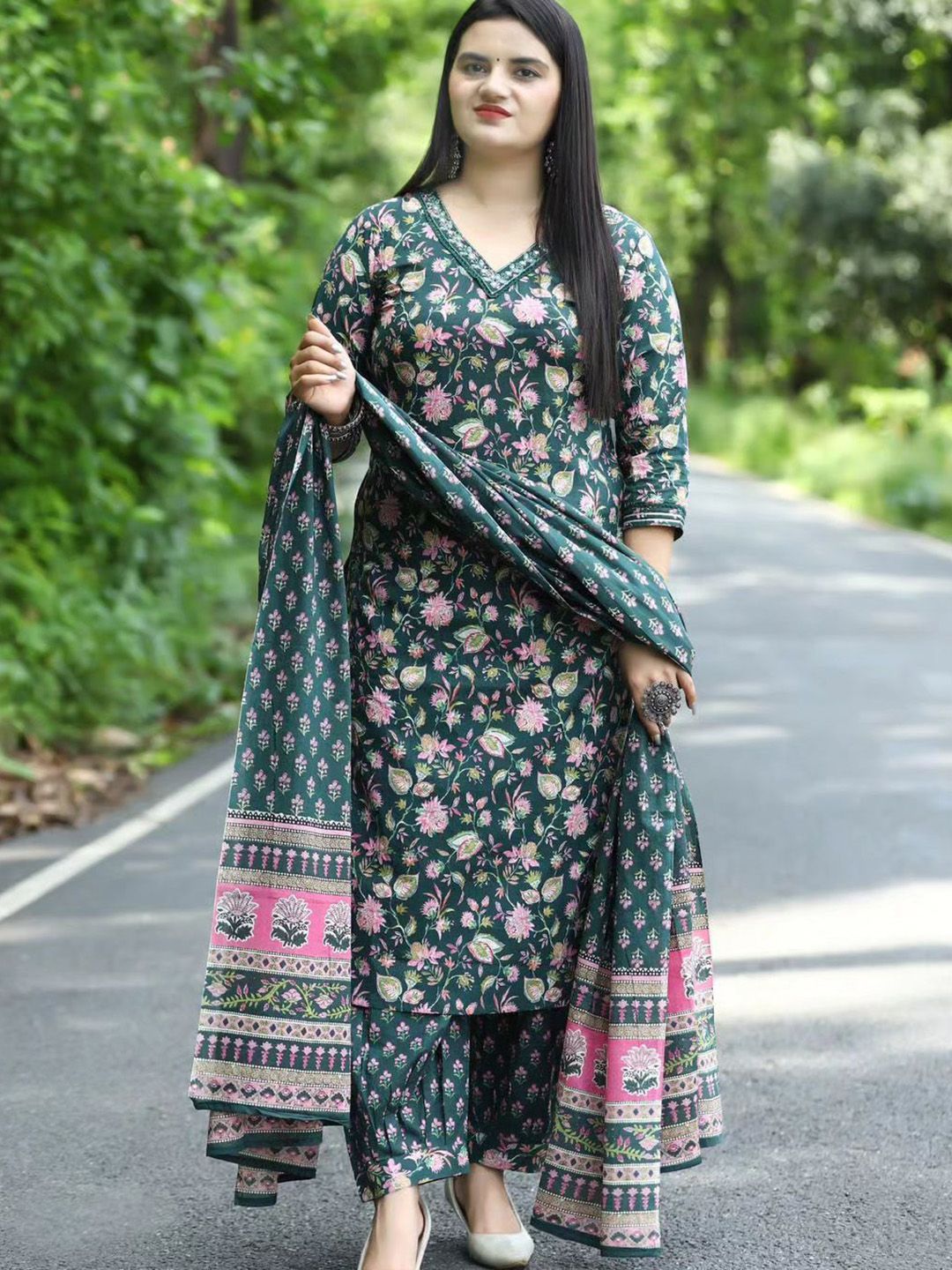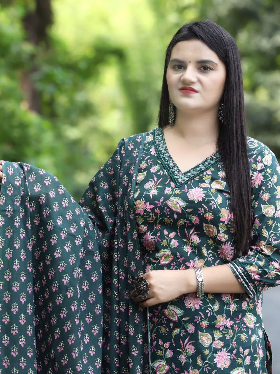 YUSRA Floral Printed V Neck Straight Kurta With Trousers & Dupatta