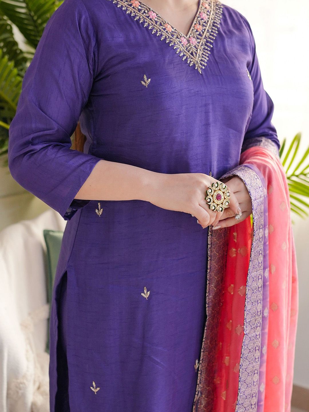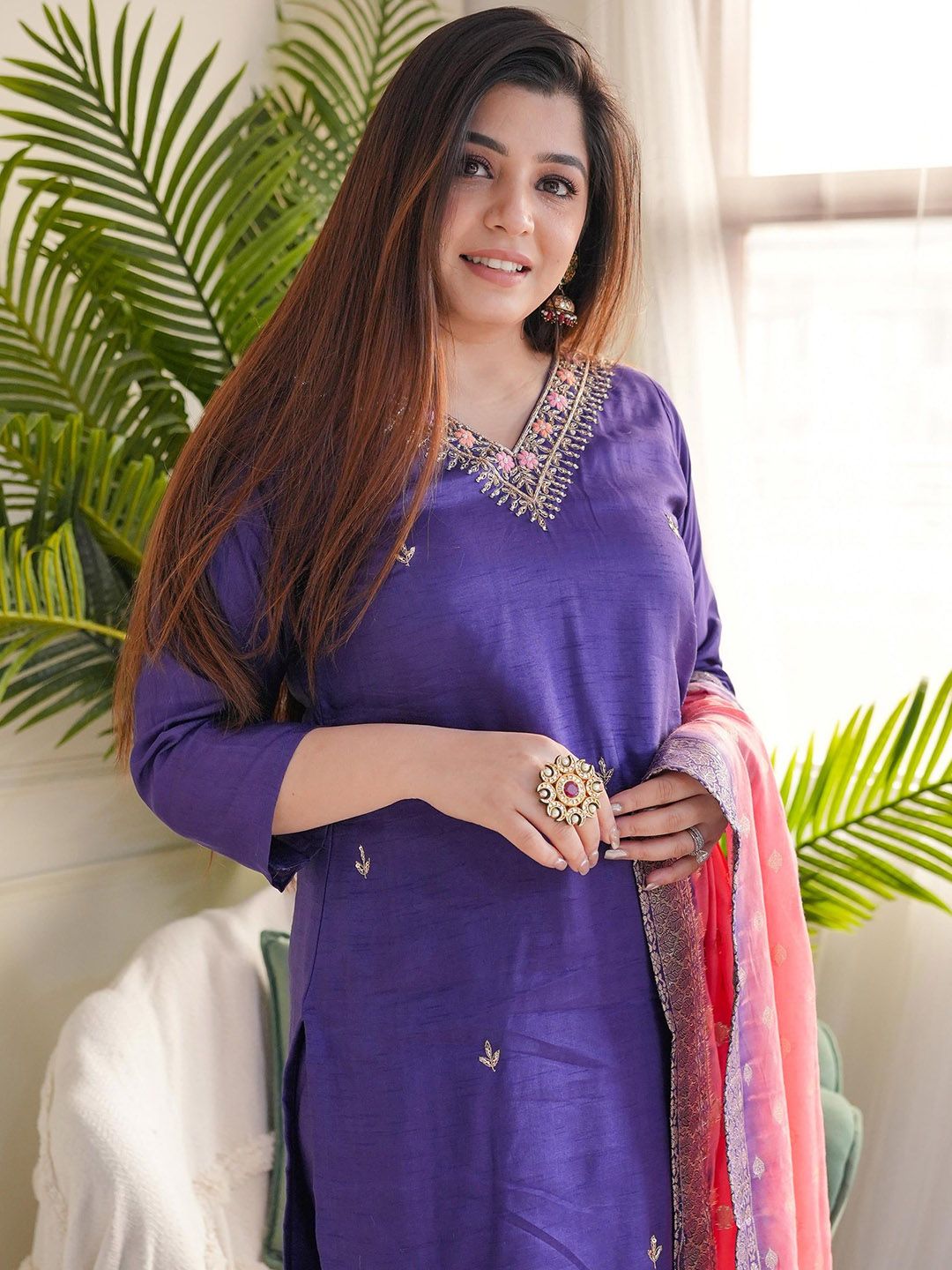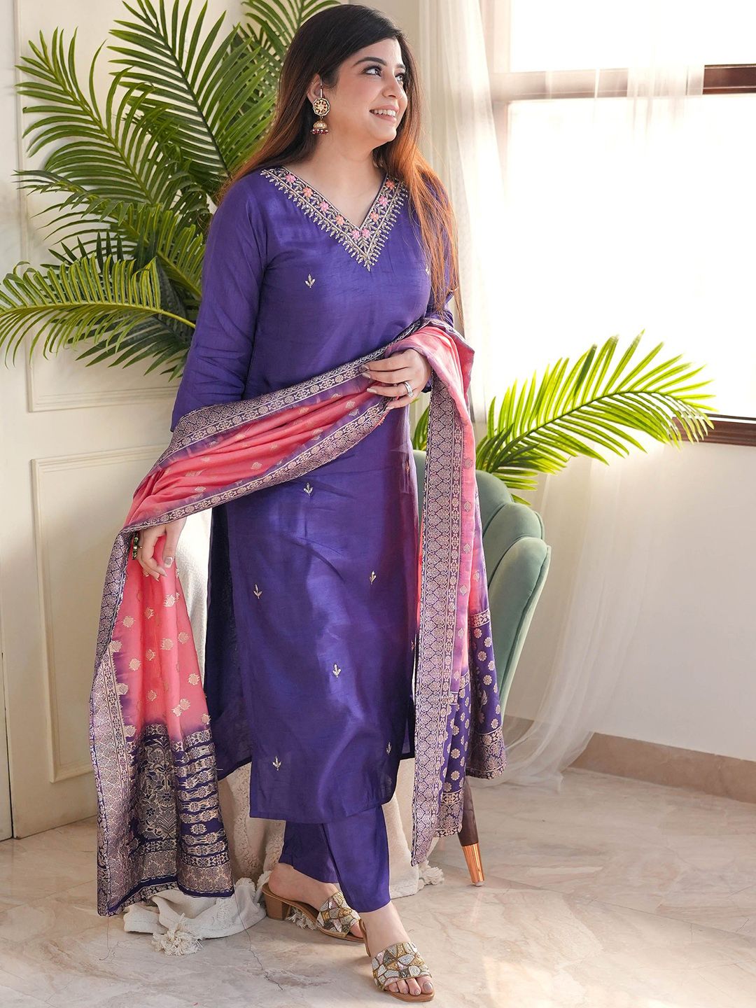 ZAIERRA Embroidered Sequinned V-Neck Kurta With Trousers & Dupatta