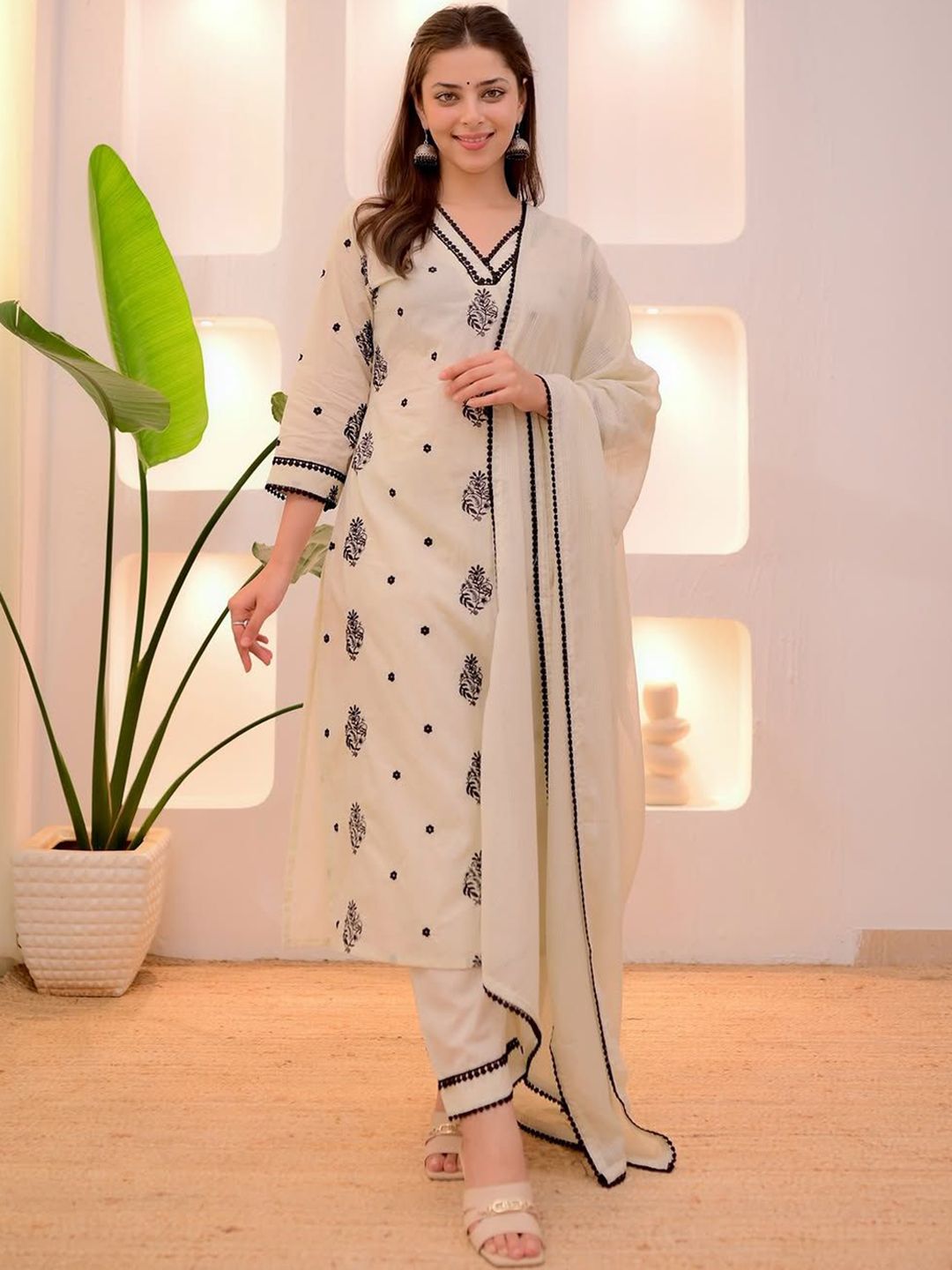 ZAIERRA Floral Embroidered V-Neck Sequinned Kurta With Trousers & Dupatta