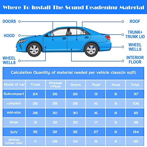 Quantity and Size: you will receive 1 roll of 196 mil/ 5 mm thick auto sound mat, measuring approx. 19.68 x 394 inch/ 50 x 1000 cm, for a total stickable area of about 53.9 sq ft/ 5 sqm, with two muffler rollers of different sizes, sufficient quantity and suitable set matching to provide you with a convenient life Effective Sound Absorption: this automotive sound insulation mat has many high density sponge pores, which improves the sound insulation effect, can suppress the vibration caused by the engine, reduce the vibration in the car, and prolong the life of the parts in the car, reduce outside noise, create a comfortable driving environment, and create a comfortable driving environment for you Flame Retardant Thermal Insulation: this foam insulation heat mat is made of high density closed cell foam, it is a versatile thermal insulation material, waterproof, oil resistant, high temperature resistant, can reflect and block the sun, machine or engine running most of the heat, keeping the car at a comfortable temperature Easy to Use: the other side of this noise insulation is easy to cut and install, suitable for various models, just use scissors or a knife to cut and trim to a suitable position, then peel off the adhesive backed protective film and place it with the matching roller roll to ensure good adhesion, easy and quick Widely Use: the function of car sound mat is practical and widely applied in engine hood, roof, rear box, car bottom, car door, truck compartment, external partition wall, firewall, body panel and internal partition under seat floor, etc., which can further improve your driving atmosphere