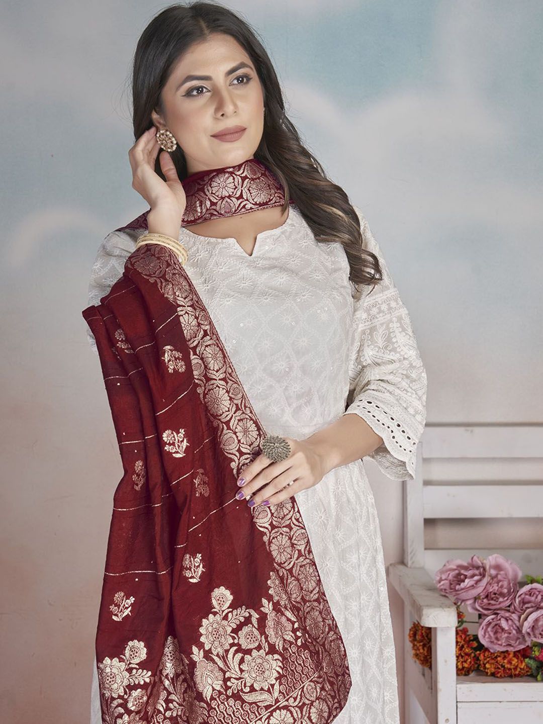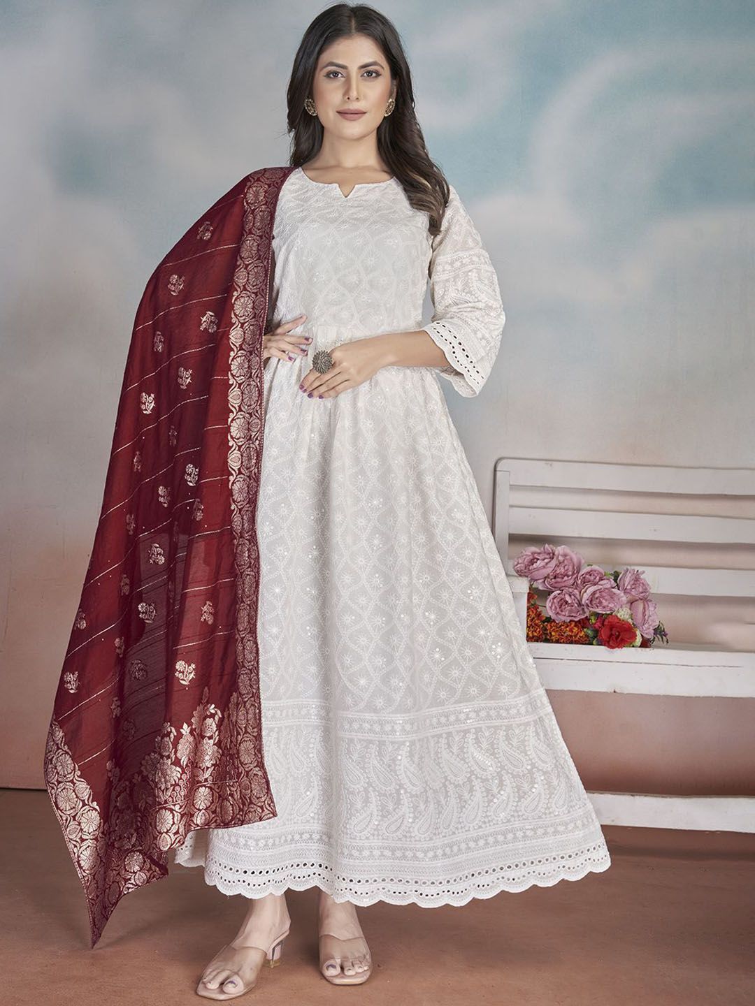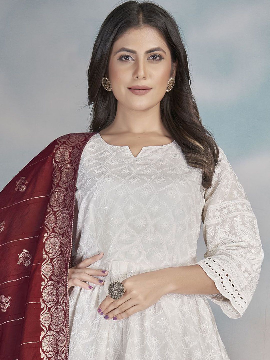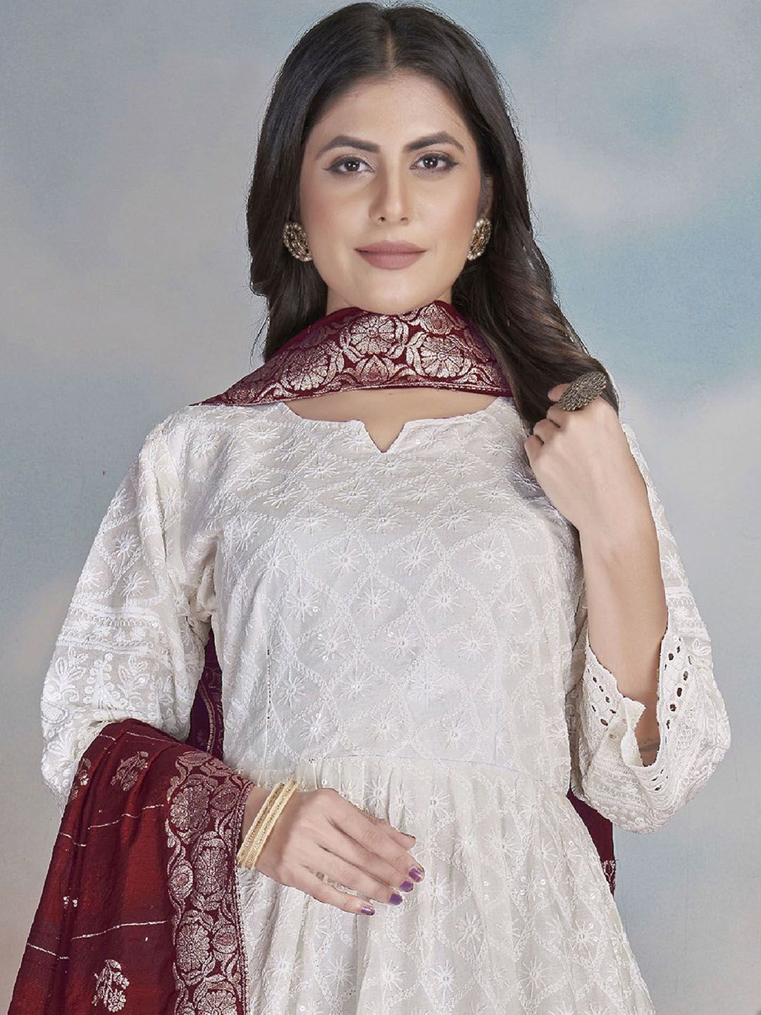 ZIRVI Embroidered Chikankari Pure Cotton Notch Neck Anarkali Kurta With Palazzos & Dupatta